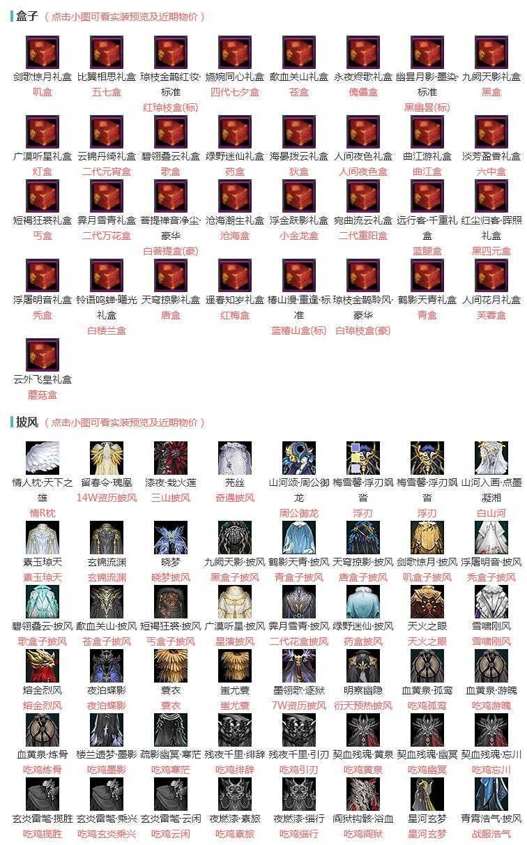 【披风】48个,[天火之眼, 雪啸刚风, 熔金烈风, 夜泊蝶影, 蓑衣, 蚩尤蓑, 7W资历披风, 衍天预热披风, 情R枕, 黑盒子披风, 14W资历披风, 战服浩气, 三山披风, 青盒子披风, 奇遇披风, 唐盒子披风, 叽盒子披风, 秃盒子披风, 歌盒子披风, 周公御龙, 苍盒子披风, 丐盒子披风, 星演披风, 二代花盒披风, 药盒披风, 浮刃(有染色), 浮刃(有染色), 白山河, 素玉琼天, 玄锦流渊, 星河玄梦, 晓梦披风]