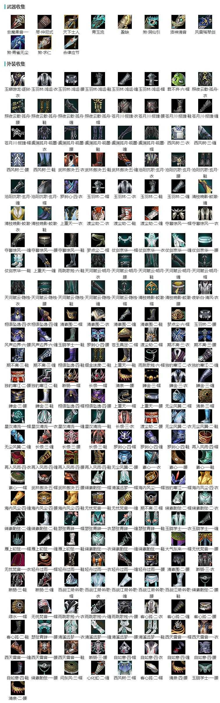 【拓印】11武器, 217成衣收集,80CW拓印洛神清音,95CW拓印盈缺,95CW拓印青玉流,110CW拓印天下士人,90奇遇CW拓印煞·洞仙引,100奇遇CW拓印煞·青雀无尘,110奇遇CW拓印煞·求仁,门派特效拓印风雷瑶琴剑,100小CW拓印合律应节