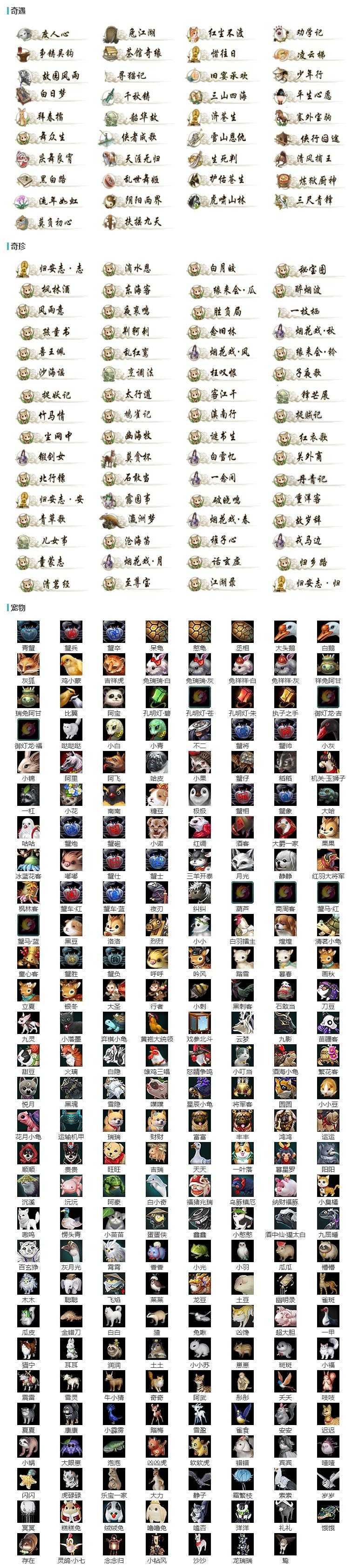 【奇遇】38个[三山四海, 天涯无归, 白日梦, 阴阳两界, 劝学记, 雪山恩仇, 兔江湖, 黑白路, 平生心愿, 莫负初心, 塞外宝驹, 惜往日, 乱世舞姬, 争铸吴钩, 韶华故, 虎啸山林, 济苍生, 少年行, 护佑苍生, 三尺青锋, 扶摇九天, 故园风雨, 流年如虹, 清风捕王, 舞众生, 侠行囧途, 茶馆奇缘, 寻猫记, 生死判, 庆舞良宵]