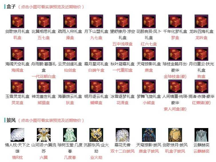 限时限量:[白九壤, 水云寒写晖, 小红龙衣, 蓝舞步, 蓝沐云, 烟花套, 十二周年工作服, 紫西风, 镜湖吹荷, 云闲归鹤, 兰若青溪, 牵云红梅, 兰庭金烬, 十四周年工作服, 霆螭月华, 客行逍遥夜影, 粉封川, 明镜高悬, 盈露川陵, 锦夜游墨羽]