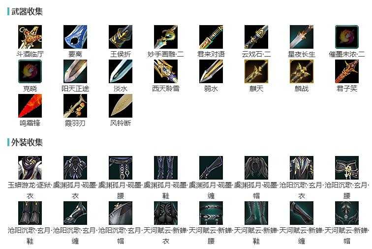 复刻:[黑潇湘, 罗姆叠银, 贺华岁霜降, 彩云归落雪, 罗姆弦月, 雪山云魂, 复刻白二娃, 无选蓝无色, 天选黄无色, 白墨韵, 玉蟒蕴, 夜斩白孤云, 夜斩白暮长, 榆塞吹角, 沧海间烟暮, 五期福袋成衣, 复刻黑三春, 风拂露夜璧]