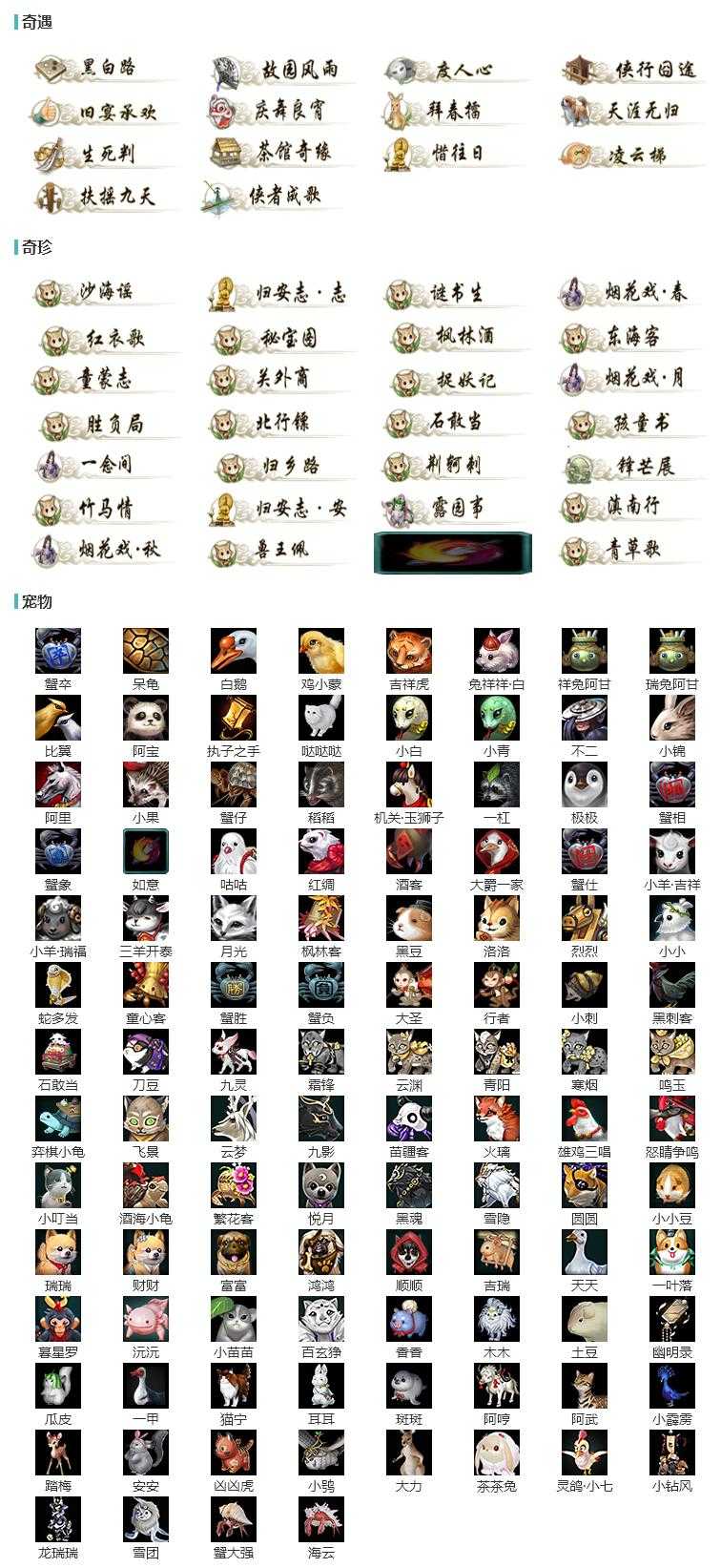 【奇遇】14个[天涯无归, 黑白路, 惜往日, 扶摇九天, 故园风雨, 侠行囧途, 茶馆奇缘, 生死判, 庆舞良宵, 凌云梯, 度人心, 旧宴承欢, 侠者成歌, 拜春擂]