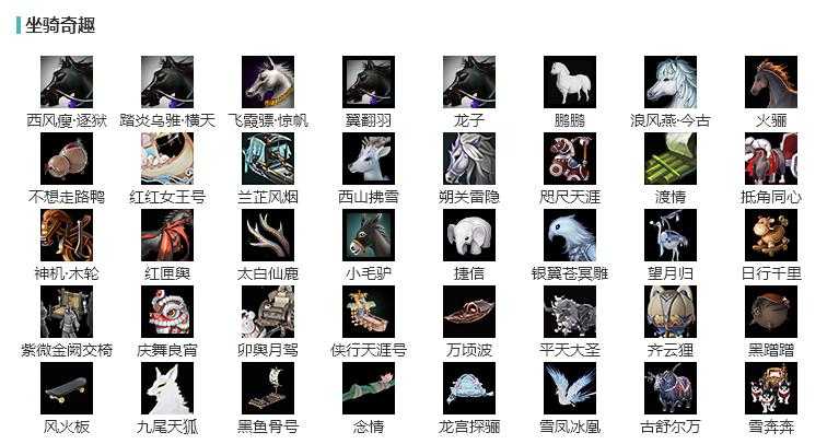 【坐骑】5个[踏炎横天, 西风瘦逐狱, 飞霞骠惊帆, 鹏鹏, 浪风燕今古]