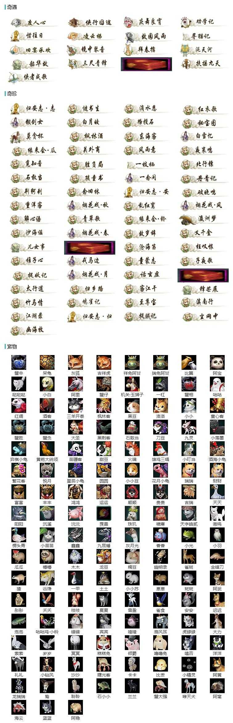 【奇遇】16个[劝学记, 惜往日, 韶华故, 三尺青锋, 扶摇九天, 故园风雨, 侠行囧途, 寻猫记, 庆舞良宵, 凌云梯, 度人心, 旧宴承欢, 镜中琴音, 侠者成歌, 拜春擂, 福运满载]
