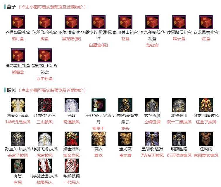 【披风】19个,[红盒子披风, 熔金烈风, 蓑衣, 蚩尤蓑, 7W资历披风, 衍天预热披风, 一代恶人, 14W资历披风, 三山披风, 战服恶人, 奇遇披风, 苍盒子披风, 喵罗干(有染色), 虎盒披风, 龙头, 玄锦流渊, 双十二黑披风]