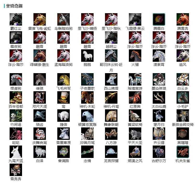 【坐骑】10个[飞毛将军, 飞霞骠黑云, 里飞沙晴扬, 翻羽抹云驹赶月, 维骐, 里飞沙踏秋, 鹏鹏, 霸红尘, 雷首飞电逾虹, 乌鬃踏焰驹]