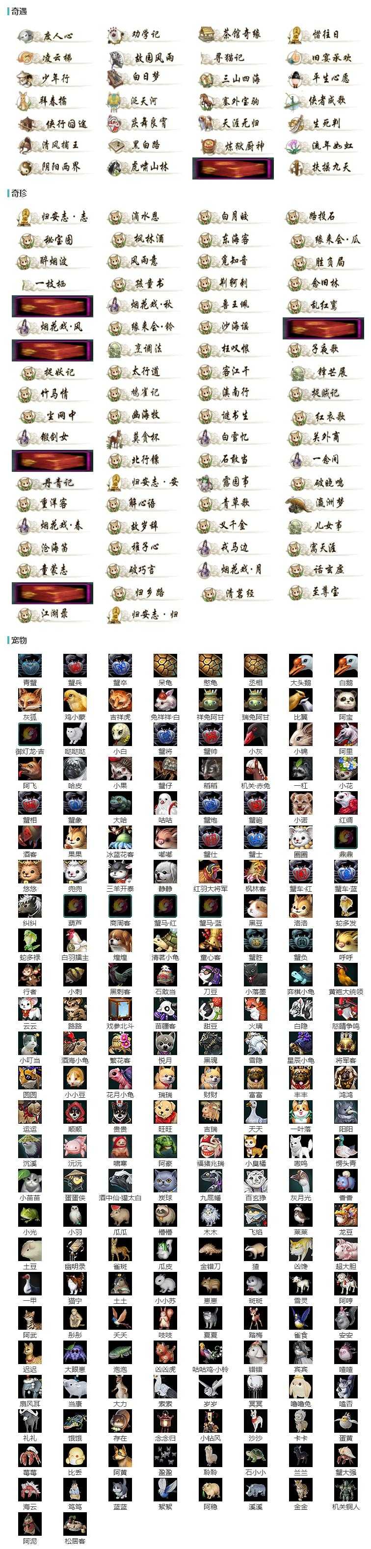 【奇珍】74个[枫林酒, 红衣歌, 归乡路, 胜负局, 孩童书, 清茗经, 捉妖记, 至尊宝, 石敢当, 稚子心]