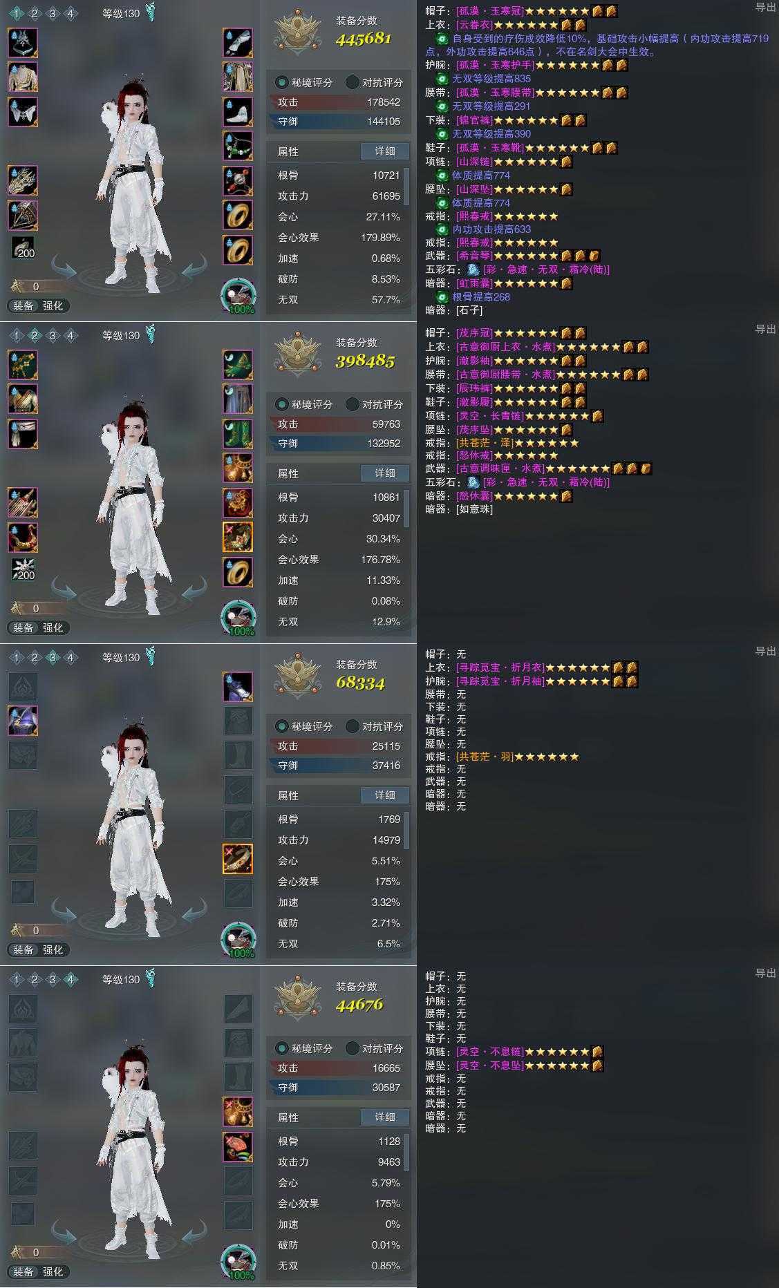 【装备】130级,莫问PVE445681,相知装备二398485,装备三68334,装备四44676