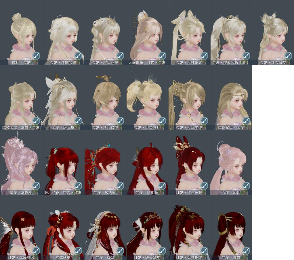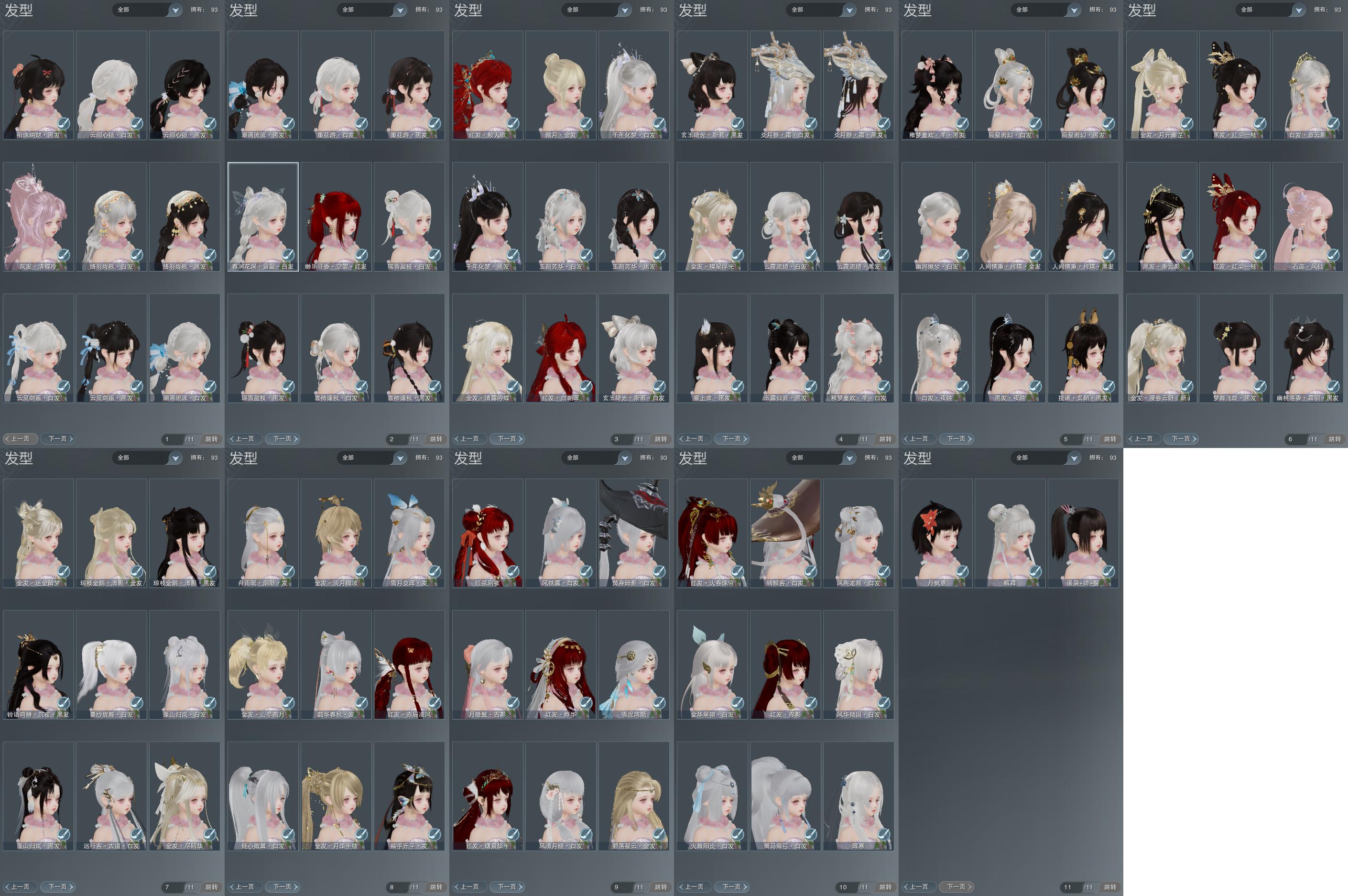 【发型】金发13个[中秋金, 鸡金, 国金, 苏金, 倒闭金, 牛金, 新云金, 香蕉金, 雪金, 水母金, 傲月金发, 绿琼枝金发, 紫人间金发], 红发12个[五红, 六红, 七红, 八红, 十二红, 十四红, 凤仙粉, 蝶粉, 猴红, 鸡红, 十五红, 绿寻香红发], 黑发29个, 白发38个, 盒子发型[二代花朝黑, 元宵黑, 一代粉中秋白, 一代七夕白, 二代七夕白, 一代花朝黄白, 雪月白发, 白腿白, 黑楼兰黑发, 二代花朝白, 丝路白, 绿琼枝黑发, 紫幽香黑发, 小熊黑发, 十二黑, 黑懒猪黑发, 紫人间黑发, 星辰黑发, 羊盒黑发, 山海黑发, 星辰白发, 羊盒白发, 雏菊黑发, 爻月祭霜黑发, 幽涧愀兮白发, 白玄玉黑发, 雏菊白发, 白爻月白发, 白雪人白发, 梦盒黑发, 柿盒黑发, 梦盒白发, 柿盒白发, 瑞雪盒黑发, 瑞雪盒白发, 重花游黑发, 仙剑黑发, 潮涌盒黑发, 蓝蝴蝶白发, 络羽黑发, 云间盒黑发, 发财黑发, 仙剑白发, 重花游白发, 潮涌盒白发, 络羽白发, 云间盒白发], 总页数11