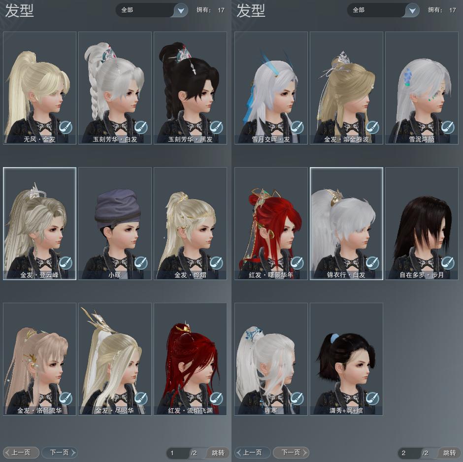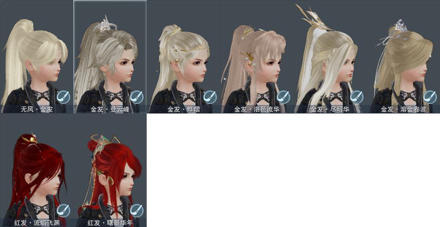 【发型】金发6个[中秋金, 蝶金, 玫瑰金, 猪金, 三代金, 无风金发], 红发2个[九红, 猴红], 黑发3个, 白发5个, 盒子发型[一代七夕白, 雪月白发], 总页数2