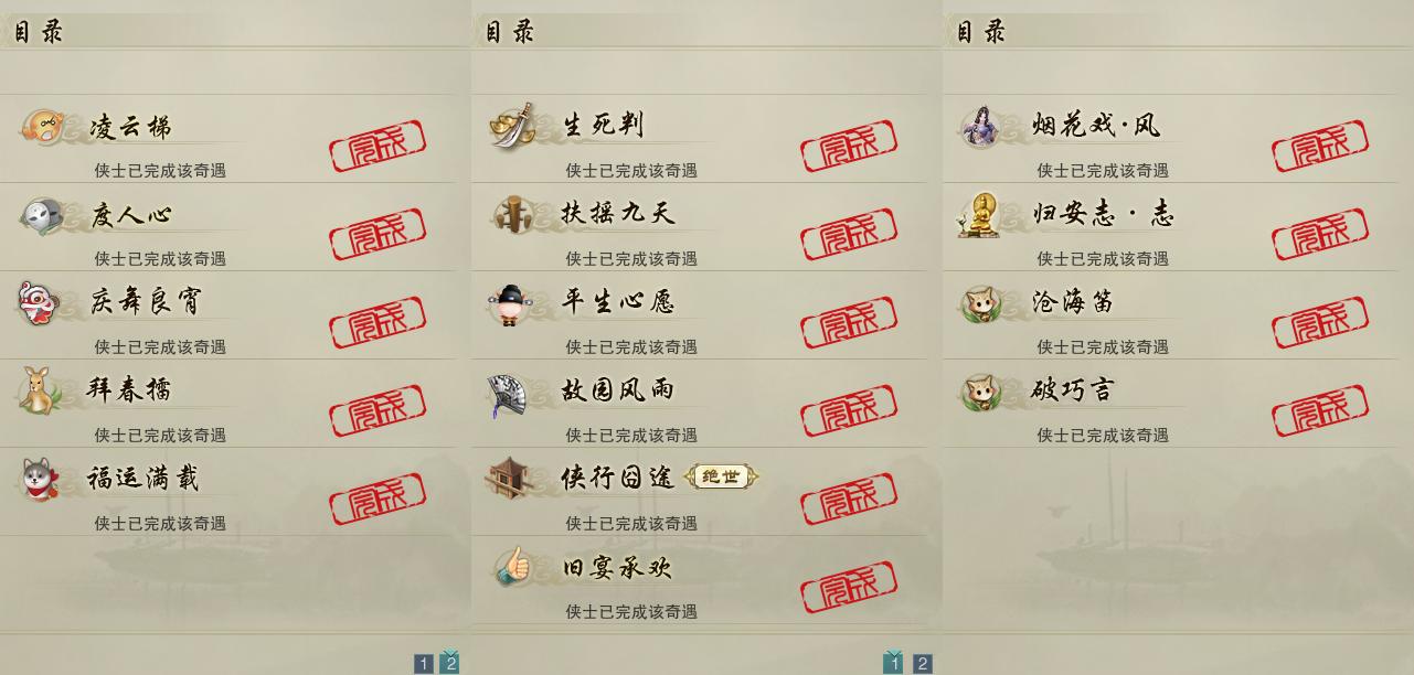 【奇遇】11个[平生心愿, 扶摇九天, 故园风雨, 侠行囧途, 庆舞良宵, 生死判, 凌云梯, 度人心, 旧宴承欢, 拜春擂, 福运满载]