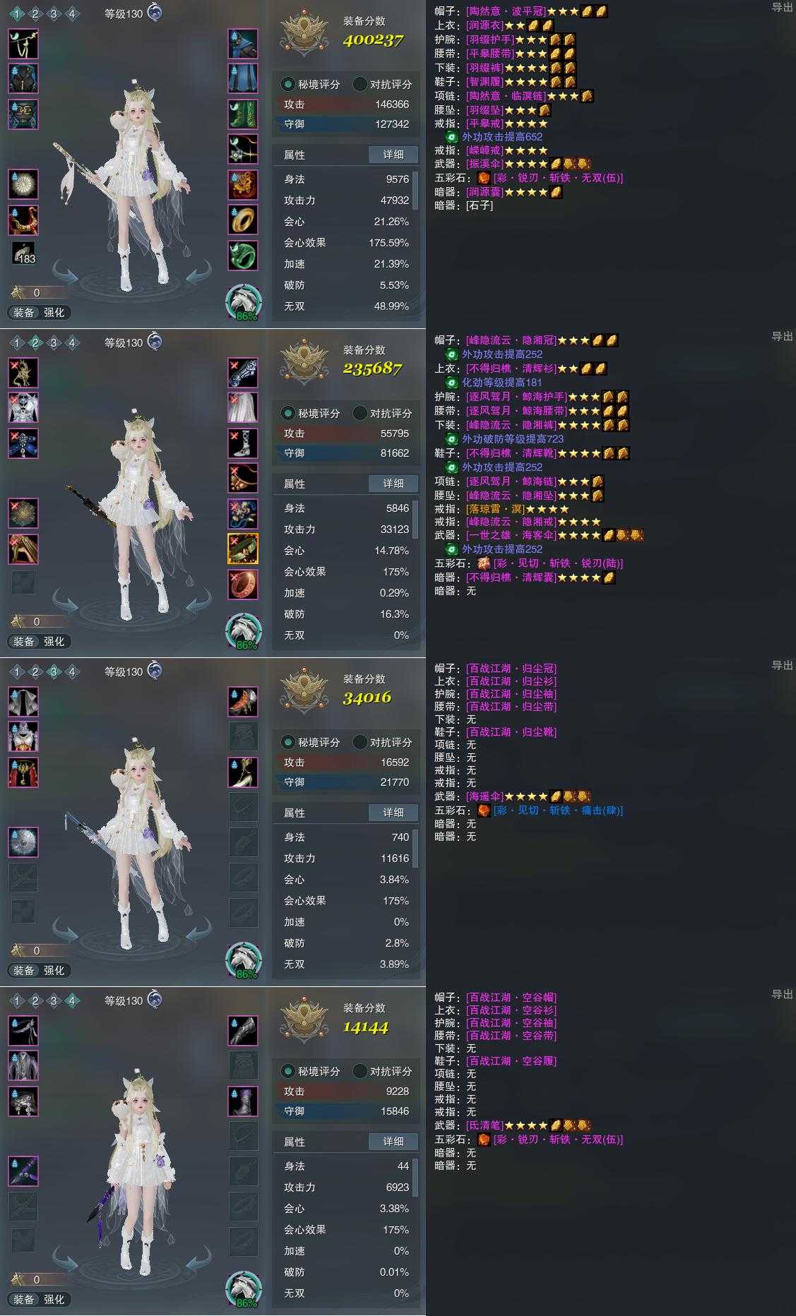 【装备】130级,蓬莱装备一400237,装备二235687,装备三34016,装备四14144