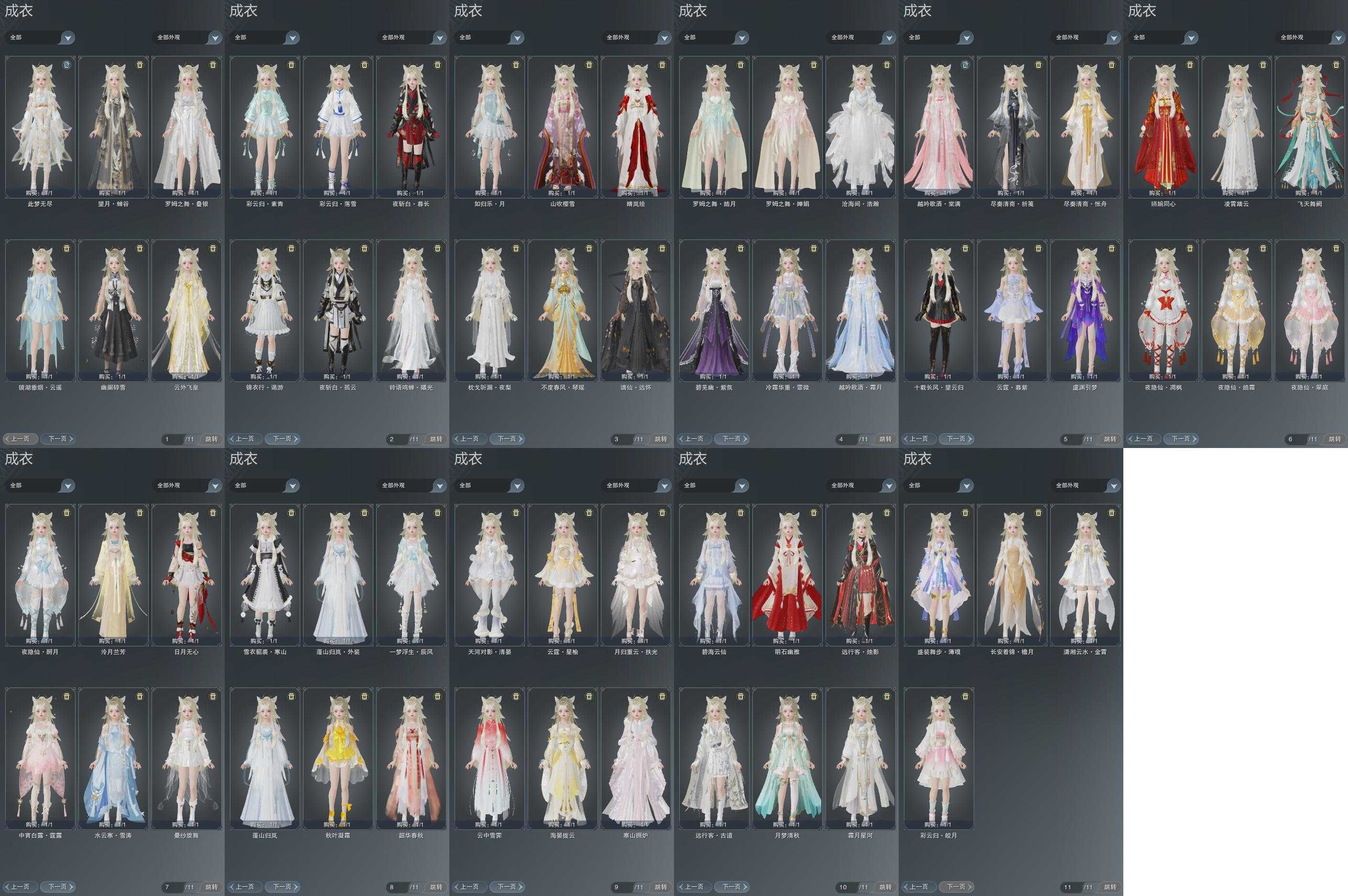 限时限量:[水云寒雪涛, 雪衣寒山, 粉舞步, 冷霜霏微, 中宵霆露, 黄长安, 烟花套, 白枕戈, 镜湖云遥, 十三周年成衣]