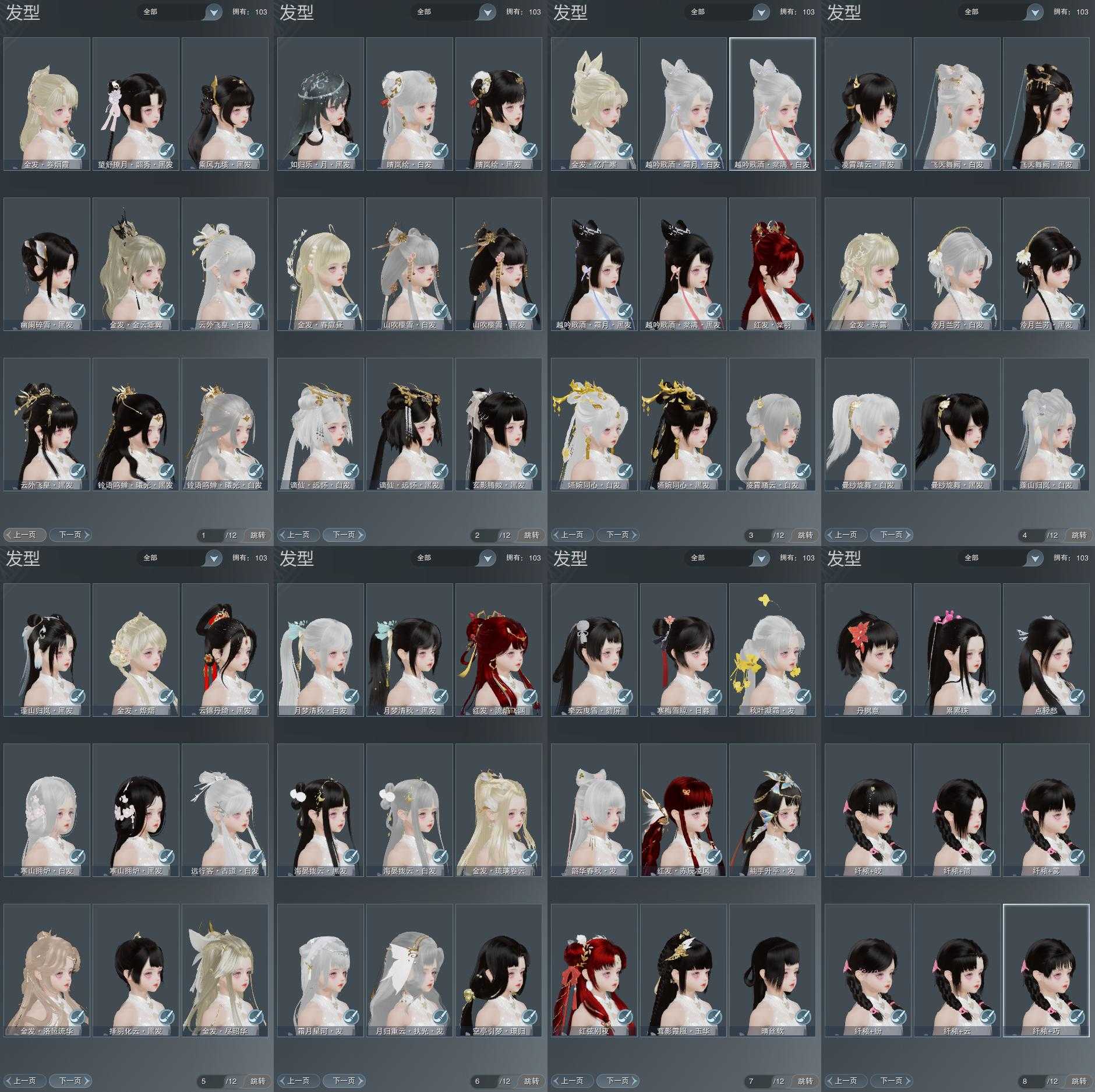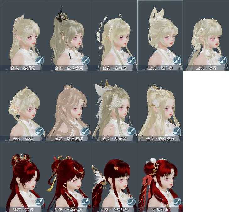 【发型】金发9个[兔金, 鼠金, 中秋金, 龙女金, 玫瑰金, 猪金, 珊瑚金, 苍金, 角金], 红发4个[八红, 九红, 十红, 鸡红], 黑发32个, 白发21个, 盒子发型[二代花朝黑, 元宵黑, 丝路黑, 狄仁杰黑, 二代七夕白, 泠月黑发, 一代重阳白, 踏云黑发, 飞天黑发, 四代七夕黑发, 四代中秋粉黑发, 四代中秋蓝黑发, 狗白, 白端午白发, 小白龙黑发, 黑谪仙黑发, 狄仁杰白, 三代中秋白, 晴岚绘黑发, 山吹樱雪黑发, 棉袄白, 白楼兰黑发, 白腿白, 二代花朝白, 丝路白, 泠月白发, 踏云白发, 绿如归黑发, 飞天白发, 四代七夕白发, 飞皇黑发, 四代中秋粉白发, 幽阑黑发, 四代中秋蓝白发, 二代乘风黑发, 黑谪仙白发, 粉中秋黑发, 晴岚绘白发, 山吹樱雪白发, 白楼兰白发, 飞皇白发], 总页数9