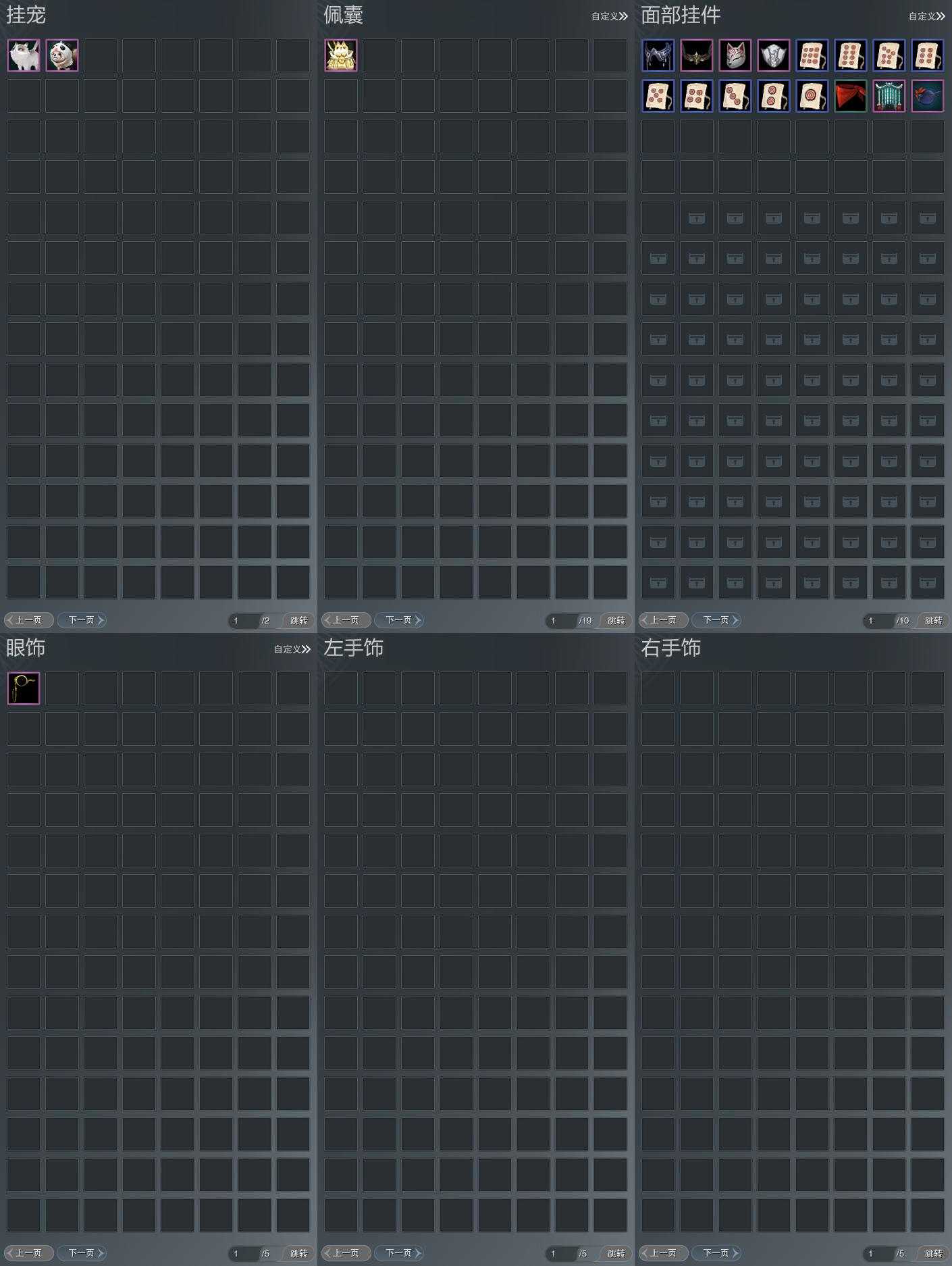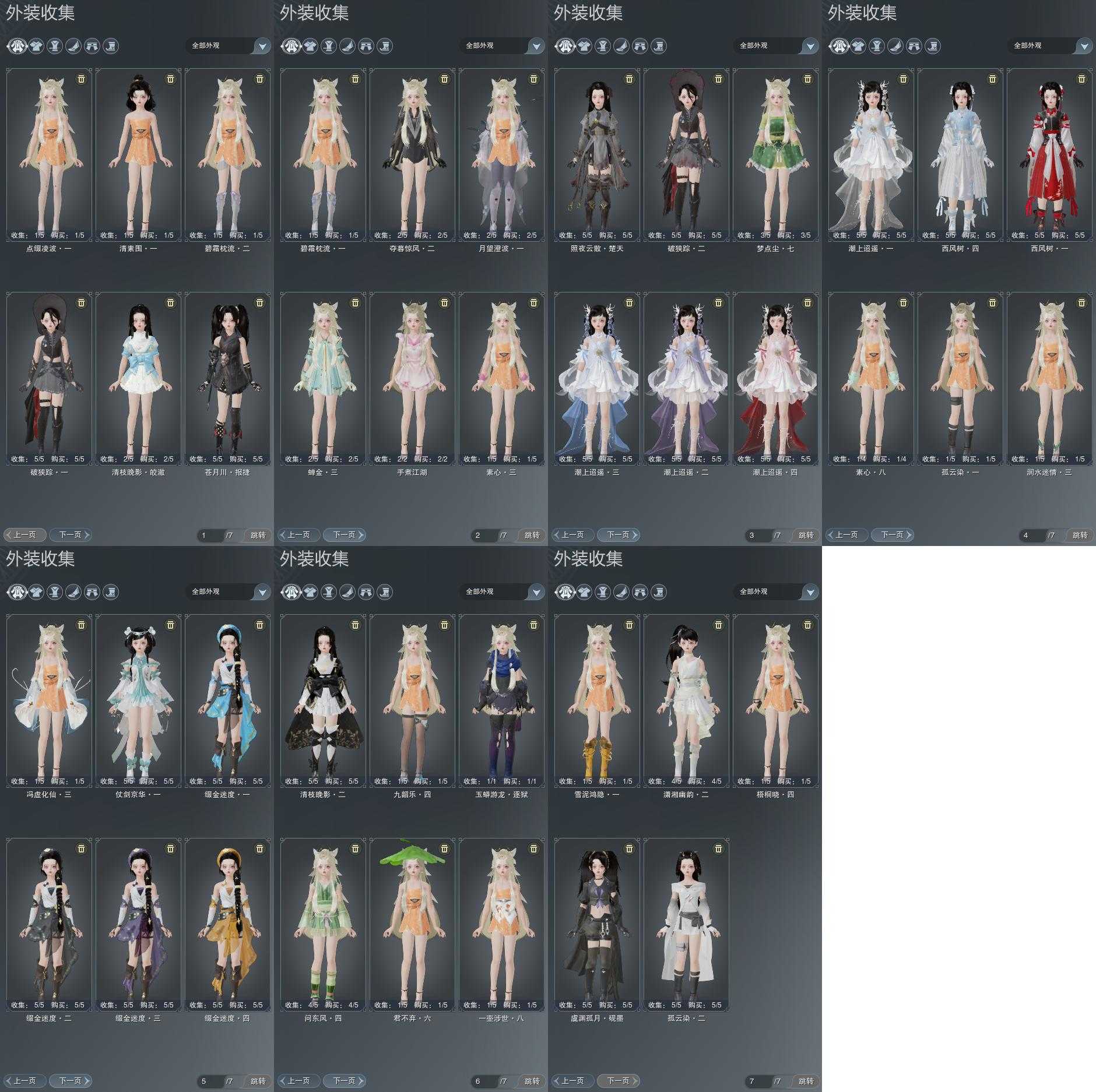 盒子:[丝路盒, 白端午盒(缺腰挂), 踏云盒, 二代花朝盒, 狗盒, 喵盒, 猪盒, 二七盒, 四代七夕盒, 蘑菇盒, 白腿盒, 毒盒, 三中盒, 蓬莱盒, 四中粉盒(缺背挂), 泠月盒(缺背挂), 四中蓝盒, 飞天盒, 一代重阳盒, 黑谪仙, 绿如归盒, 棉袄盒, 三代元宵盒, 樱花盒, 白楼兰盒]