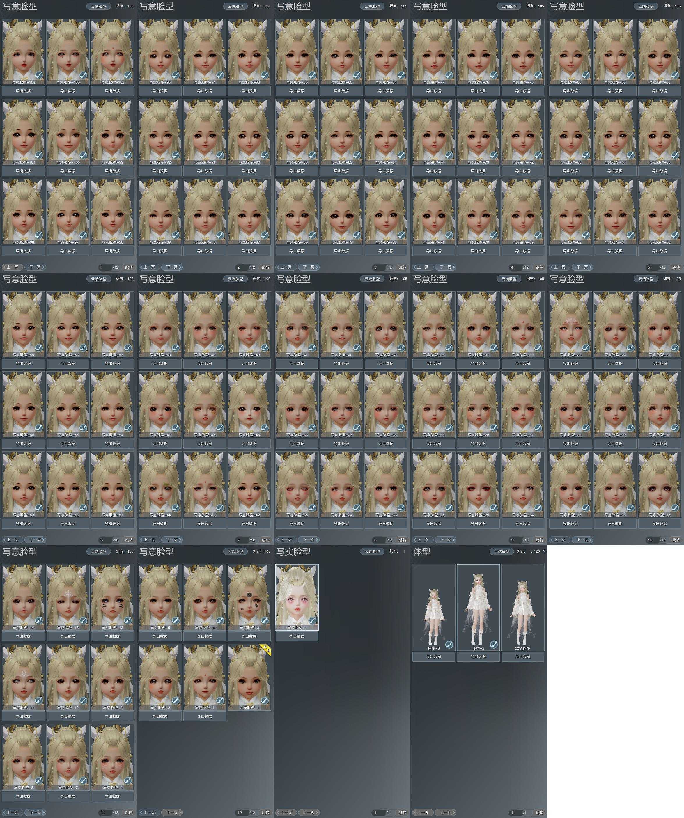 【捏脸】写意脸型105个,写实脸型1个,体型3个