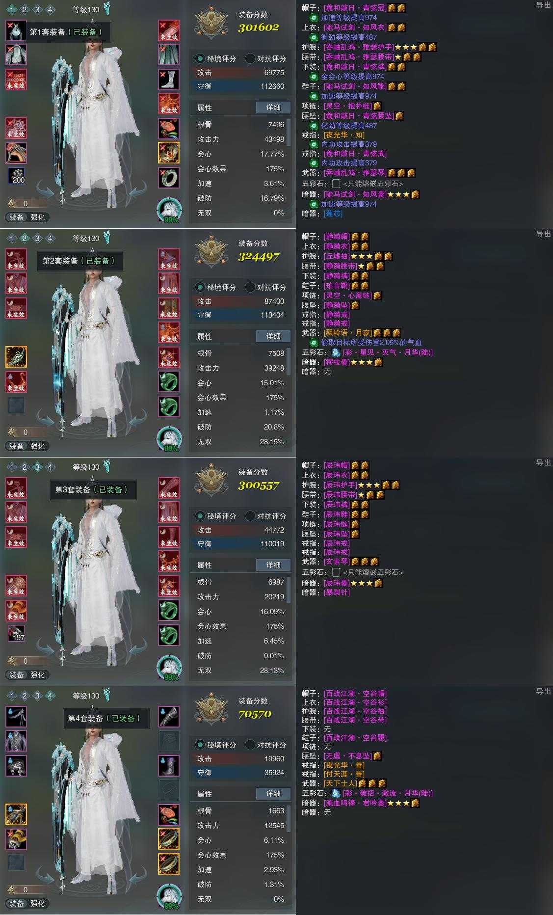 【装备】130级,装备一301602,装备二324497,装备三300557,装备四70570