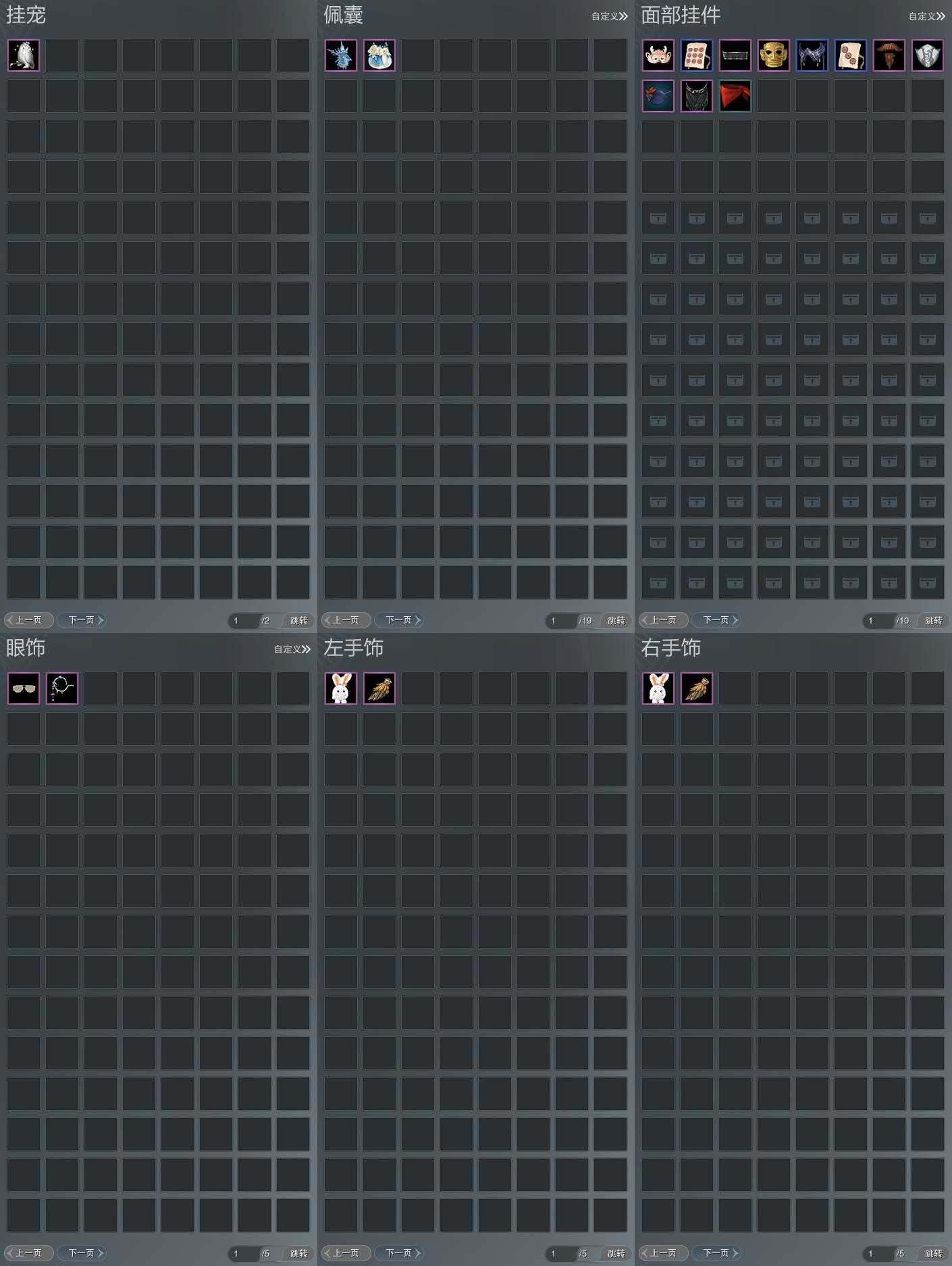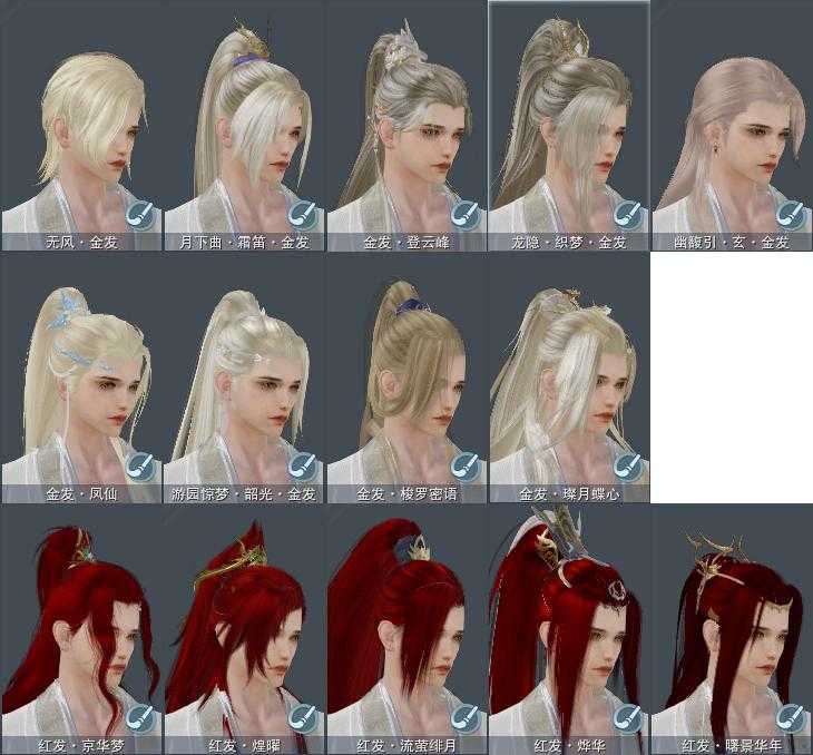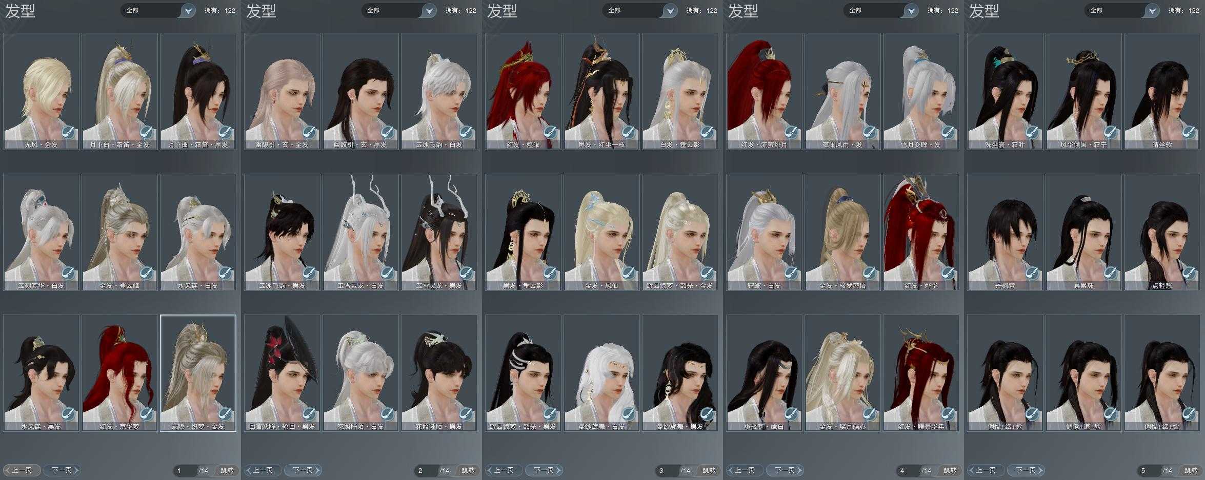 【发型】金发9个[狐金, 资历金, 凤仙金, 三代金, 无风金发, 白游园金发, 黑幽馥金发, 白龙隐金发, 紫月下金发], 红发5个[七红, 猴红, 兔红, 小资历红, 龙红], 黑发19个, 白发10个, 盒子发型[丝路黑, 黑端午白发, 雪月白发, 丝路白, 白游园黑发, 十二黑, 踏青黑发, 红黑妖眸盒黑发, 灵龙盒黑发, 蓝兔盒黑发, 踏青白发, 灵龙白发, 蓝兔盒白发, 黑幽馥黑发, 紫月下黑发], 总页数5