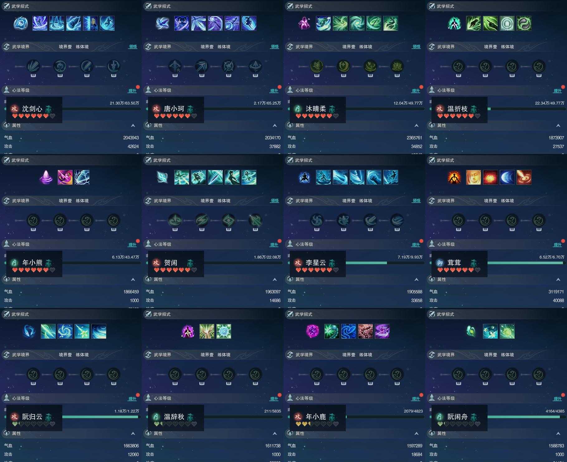 【同伴】沈剑心82级境界壹,唐小珂81级境界壹,沐晴柔79级境界壹,温折枝79级境界壹,年小熊78级境界壹,贺闲73级境界壹,李星云67级境界壹,茸茸64级境界壹,阮归云51级境界壹,温辞秋44级境界壹,年小鹿42级境界壹,阮闲舟41级境界壹