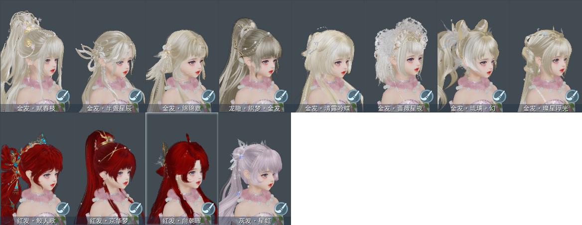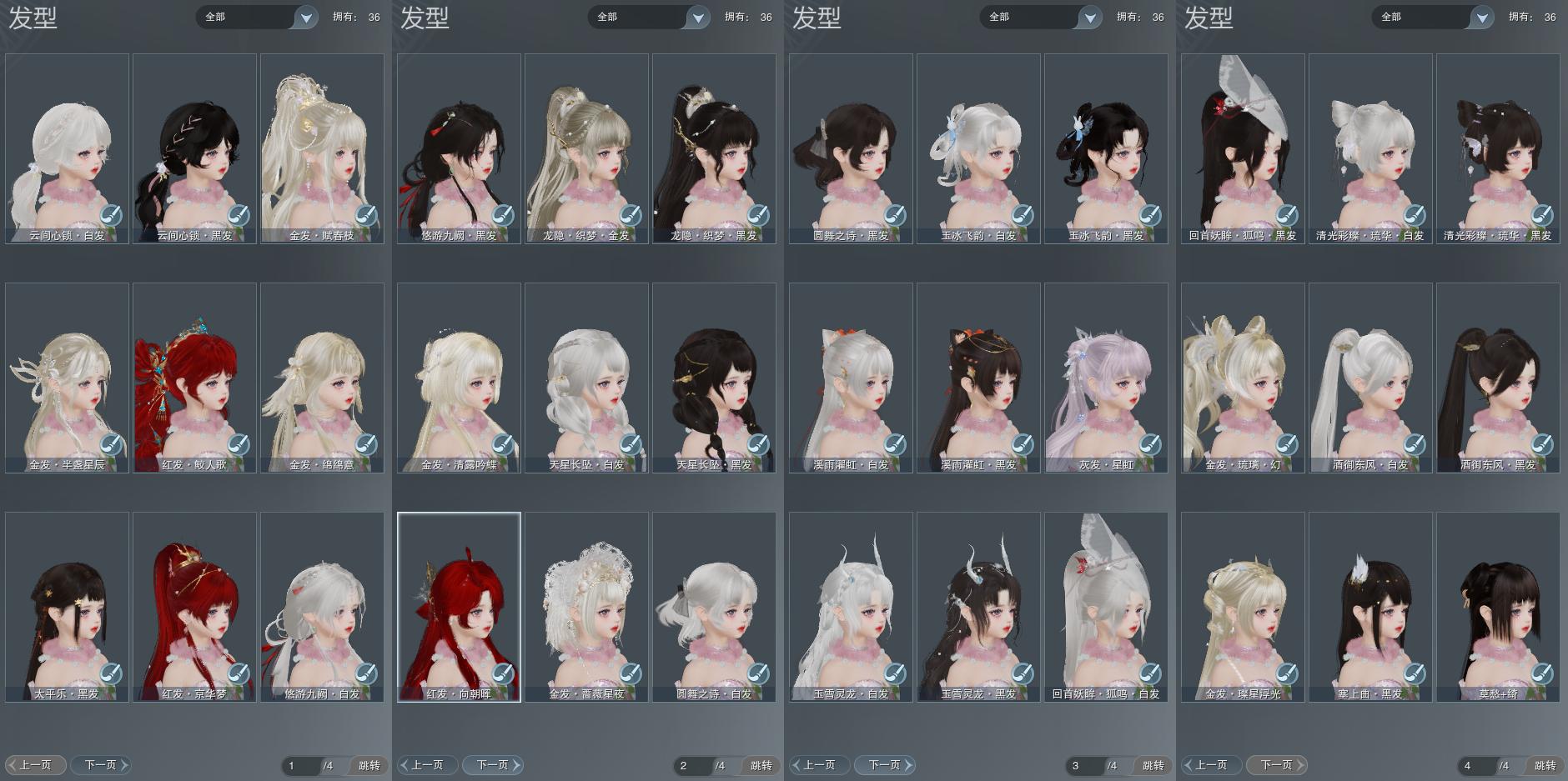 【发型】金发8个[雪金, 海金, 蔷薇金, 水母金, 咩金, 精灵金, 蛇金, 白龙隐金发], 红发4个[十四红, 龙红, 十五红, 二代灰], 黑发13个, 白发10个, 盒子发型[卿酒盒黑发, 蓝钻石盒黑发, 红白妖眸盒黑发, 卿酒盒白发, 蓝钻石盒白发, 灵龙盒黑发, 虹猫盒黑发, 蓝兔盒黑发, 圆舞盒黑发, 红白妖眸盒白发, 灵龙白发, 虹兔盒白发, 蓝兔盒白发, 圆舞盒白发, 天星盒黑发, 白龙隐黑发, 游龙盒黑发, 天星盒白发, 游龙盒白发, 云间盒黑发, 云间盒白发], 总页数4