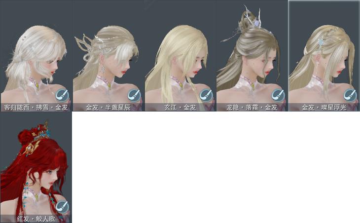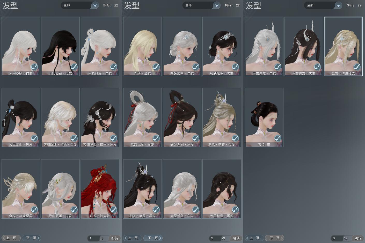 【发型】金发5个[雪金, 玄江金发, 精灵金, 蓝龙隐金发, 白陇西金发], 红发1个[十五红], 黑发8个, 白发7个, 盒子发型[灵龙盒黑发, 灵龙白发, 天星盒黑发, 蓝龙隐黑发, 游龙盒黑发, 婚纱盒黑发, 天星盒白发, 游龙盒白发, 婚纱盒白发, 白陇西黑发, 仙剑黑发, 云间盒黑发, 仙剑白发, 云间盒白发], 总页数3