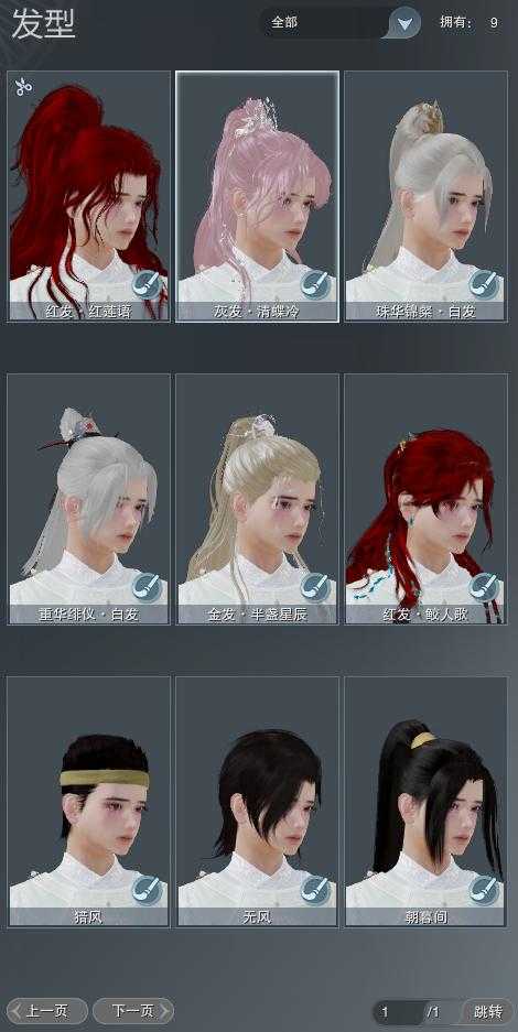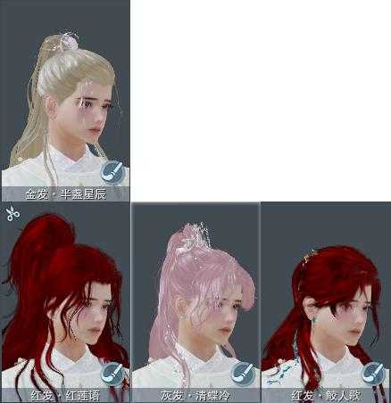 【发型】金发1个[精灵金], 红发3个[蝶粉, 十五红, 十六红], 黑发4个, 白发3个, 盒子发型[], 总页数1