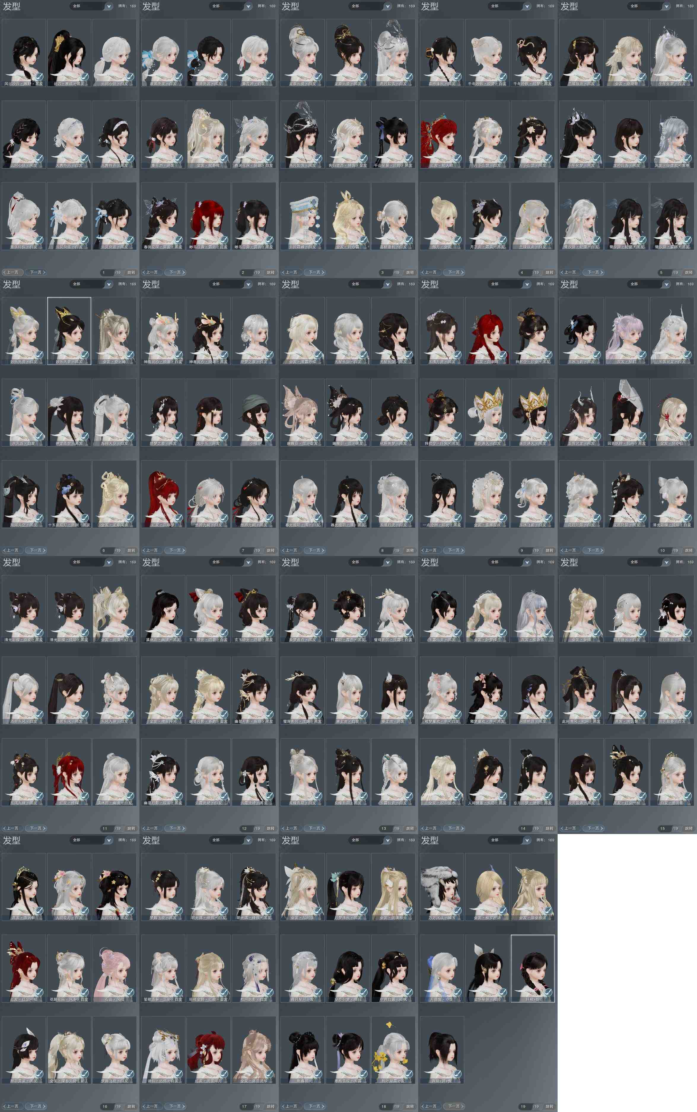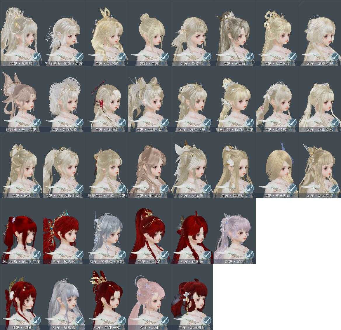 【发型】金发24个[资历金, 中秋金, 蝶金, 龙女金, 玫瑰金, 新云金, 虎金, 呱金, 女仆金, 雪金, 海金, 刺金, 蔷薇金, 水母金, 龙金, 三代金, 咩金, 铃金, 傲月金发, 蛇金, 红琼枝金发, 绿幽昙金发, 白幽馥金发, 白陇西金发], 红发11个[十二红, 十四红, 凤仙粉, 兔红, 小资历红, 龙红, 十五红, 紫寻香红发, 二代灰, 一代灰, 三代灰银], 黑发81个, 白发54个, 盒子发型[一代蓝中秋白, 一代重阳白, 白端午白发, 黑谪仙白发, 同人白发, 唐风玉壶白发, 白明光黑发, 小熊黑发, 孔雀黑发, 十二黑, 芙蓉黑发, 六代中秋黑发, 白明光白发, 小熊白发, 红六七白发, 芙蓉白发, 六代中秋白发, 原色异域黑发, 蝴蝶黑发, 白忘川黑发, 绿人间黑发, 蝴蝶白发, 羊盒黑发, 山海黑发, 七七黑发, 七中白盒黑发, 羊盒白发, 竹露响霜色黑发, 山海白发, 乘梦虚舟黑发, 七七白发, 红幽昙黑发, 七中白盒白发, 白幽昙黑发, 雏菊黑发, 红玄玉黑发, 黑傣族黑发, 雏菊白发, 除夕盒黑发, 卿酒盒黑发, 红雪人白发, 蓝钻石盒黑发, 粉钻石盒黑发, 黑傣族白发, 踏青黑发, 除夕盒白发, 红白妖眸盒黑发, 卿酒盒白发, 蓝钻石盒白发, 灵龙盒黑发, 蓝兔盒黑发, 粉沧洲盒黑发, 踏青白发, 西游盒黑发, 灵龙白发, 红持君盒黑发, 金持君盒黑发, 蓝兔盒白发, 八七盒黑发, 白八中黑发, 六代重阳黑发, 白幽馥黑发, 西游盒白发, 天星盒黑发, 八七盒白发, 白八中白发, 游龙盒黑发, 婚纱盒黑发, 天星盒白发, 粉鹿黑发, 蓝观灯盒黑发, 海阔盒黑发, 游龙盒白发, 熊猫黑发, 妙乐盒黑发, 白鹭黑发, 婚纱盒白发, 粉鹿白发, 蓝鹭黑发, 龙吟盒黑发, 梦盒黑发, 兰陵盒黑发, 海阔盒白发, 紫月下黑发, 妙乐盒白发, 九七黑发, 蓝鹭白发, 白蛇盒黑发, 柿盒黑发, 梦盒白发, 兰陵盒白发, 九七白发, 蓝千山黑发, 柿盒白发, 白蛇盒白发, 燕月盒黑发, 墨龙盒黑发, 紫寻香黑发, 云掠霜峰白发, 蓝蝴蝶黑发, 燕月盒白发, 墨龙盒白发, 重花游黑发, 仙剑黑发, 潮涌盒黑发, 蓝蝴蝶白发, 瓷盒黑发, 云间盒黑发, 仙剑白发, 重花游白发, 潮涌盒白发, 黄问刀黑发, 瓷盒白发, 云间盒白发, 紫沙丘黑发], 总页数19