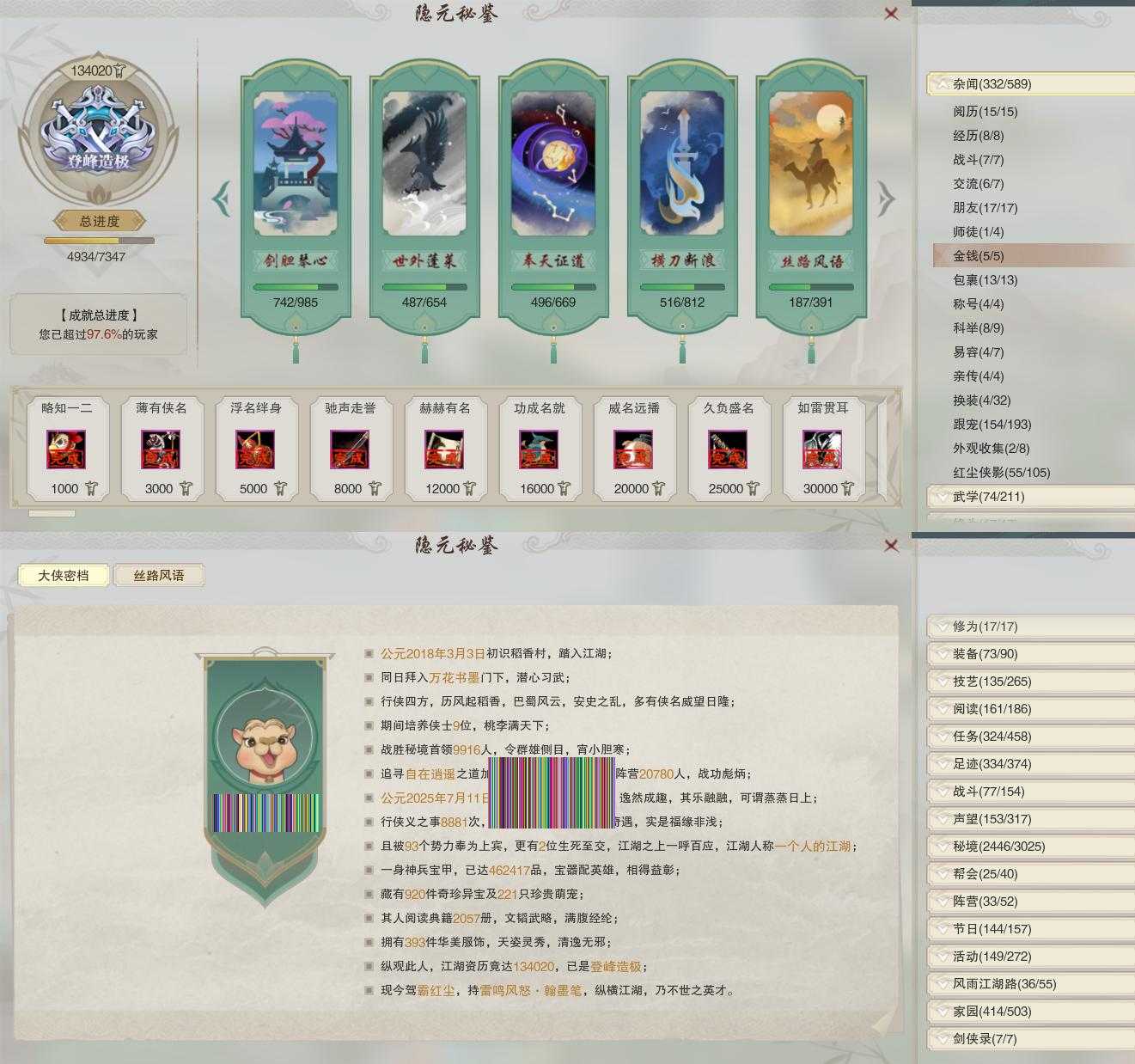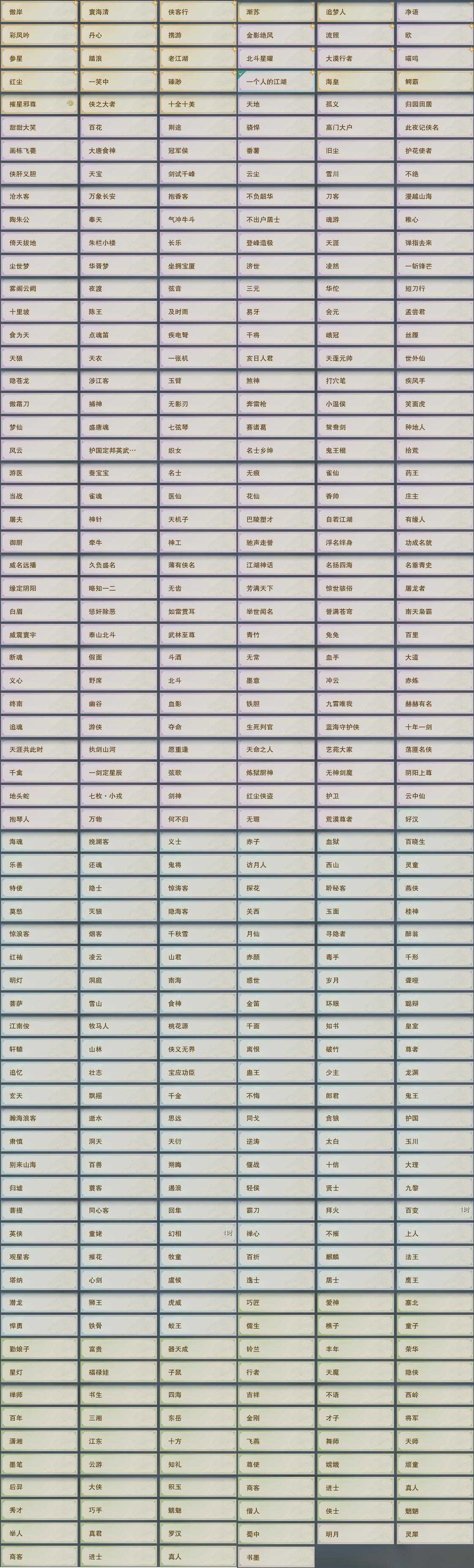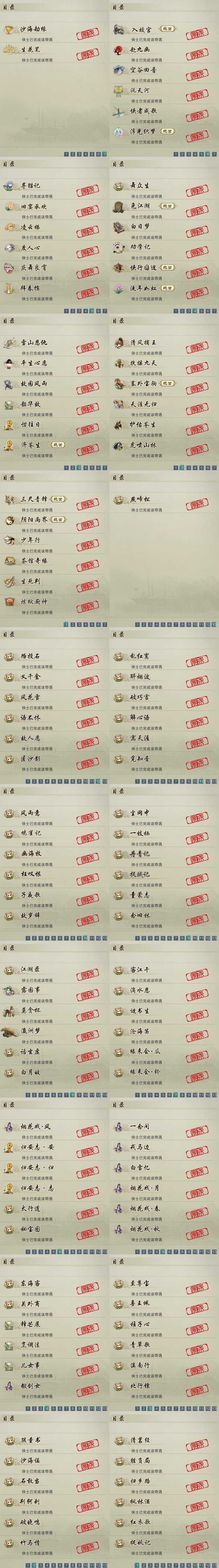 【奇遇】38个[白日梦, 天涯无归, 劝学记, 雪山恩仇, 阴阳两界, 兔江湖, 平生心愿, 惜往日, 塞外宝驹, 韶华故, 虎啸山林, 济苍生, 护佑苍生, 少年行, 故园风雨, 扶摇九天, 三尺青锋, 舞众生, 流年如虹, 清风捕王, 寻猫记, 侠行囧途, 茶馆奇缘, 入蛟宫, 庆舞良宵, 生死判, 凌云梯, 炼狱厨神, 赴九幽, 度人心]