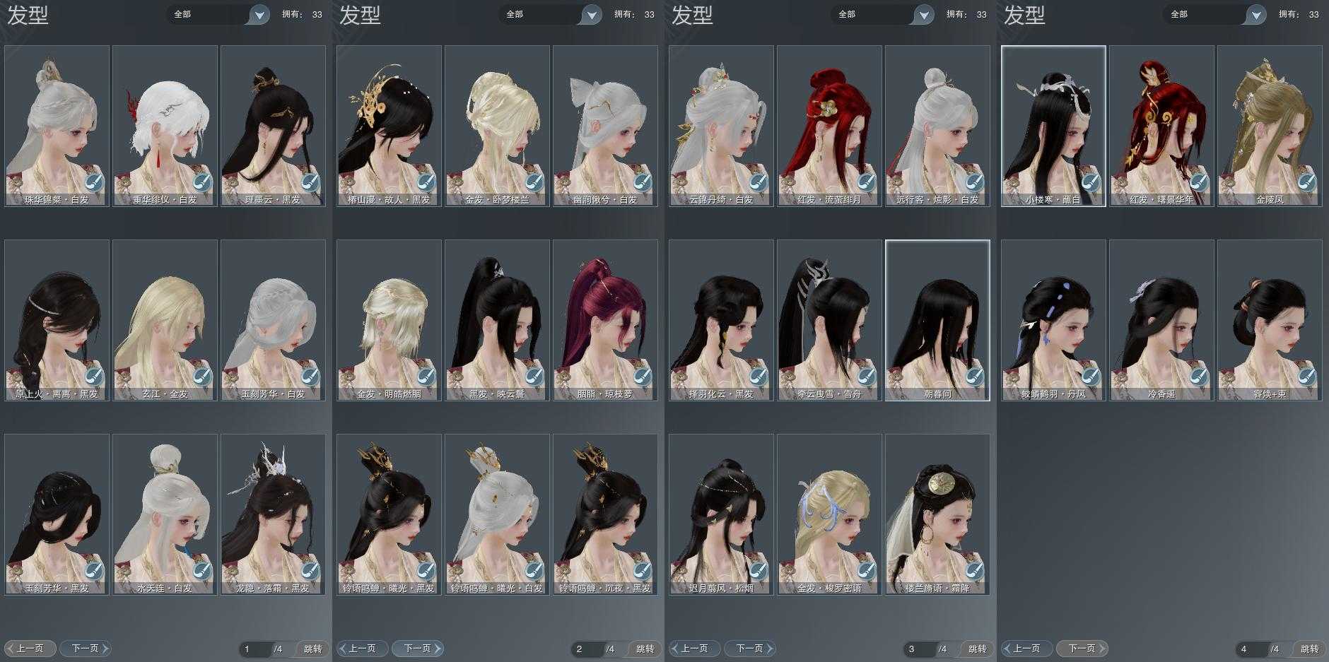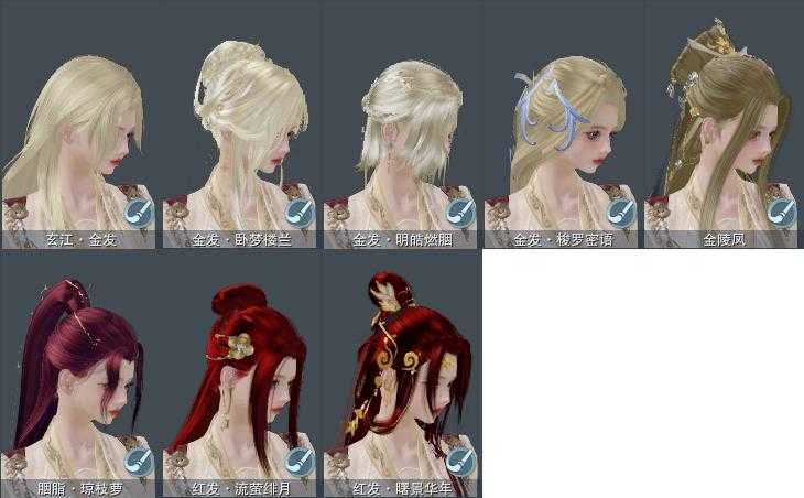 【发型】金发5个[一代金, 资历金, 双十二金发, 女仆金, 玄江金发], 红发3个[紫发, 猴红, 小资历红], 黑发16个, 白发9个, 盒子发型[二代元宵白, 白楼兰黑发, 黑楼兰黑发, 红腿白, 白楼兰白发, 黑楼兰白发, 幽涧愀兮白发, 黑椿山黑发, 蓝龙隐黑发, 红上火黑发], 总页数4
