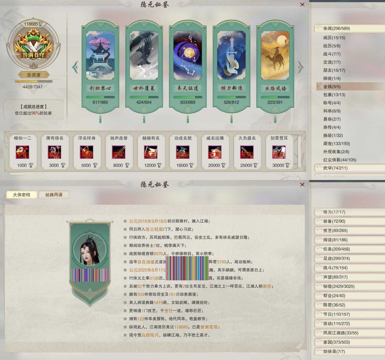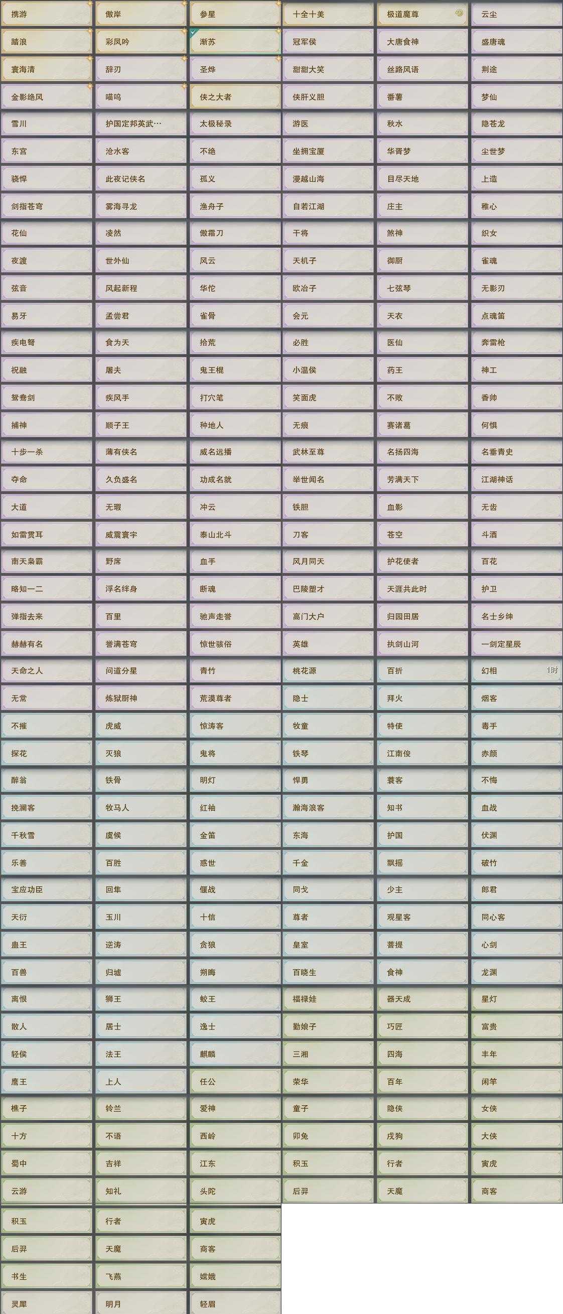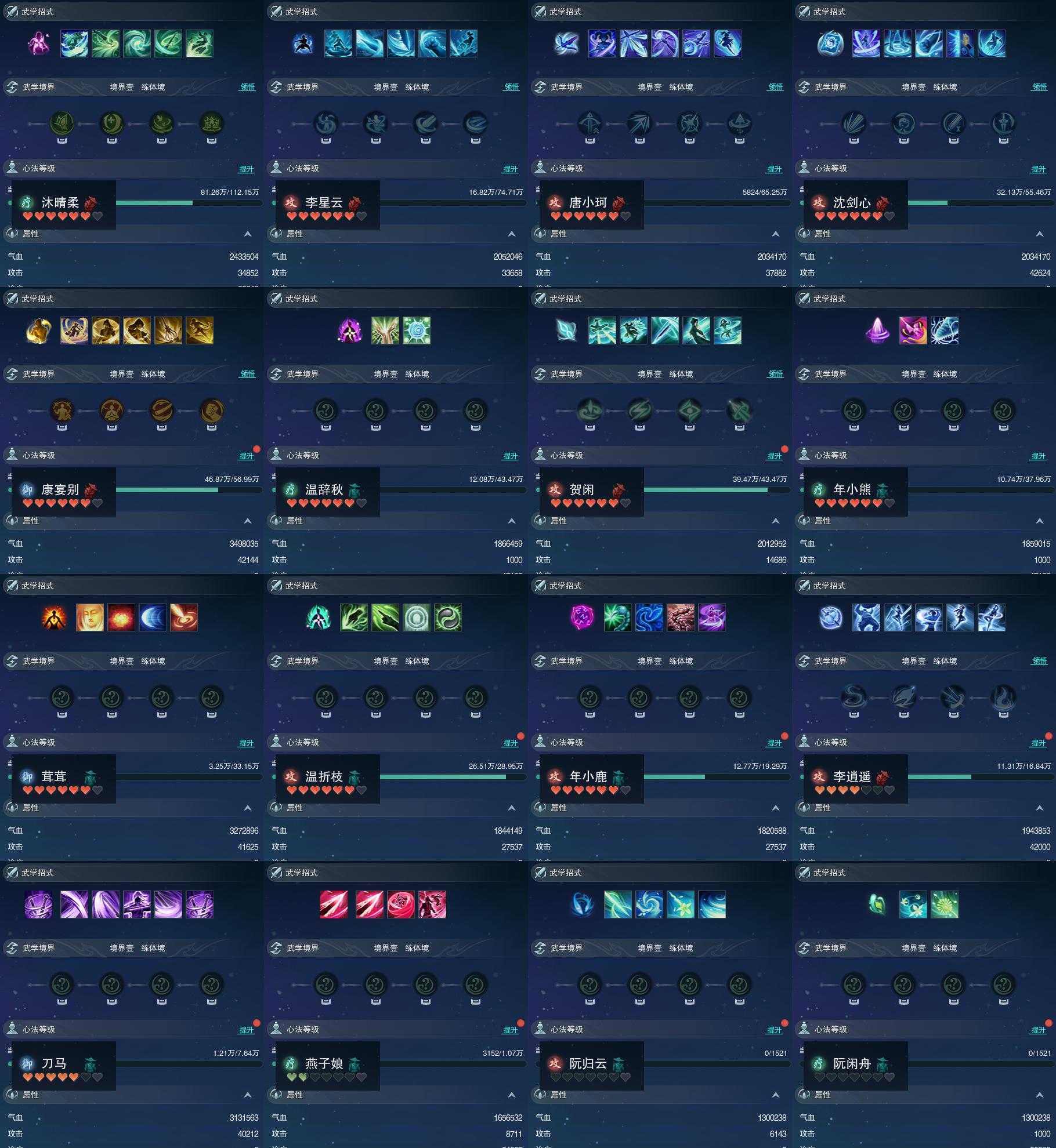 【同伴】沐晴柔85级境界壹,李星云82级境界壹,唐小珂81级境界壹,沈剑心81级境界壹,康宴别80级境界壹,温辞秋78级境界壹,贺闲78级境界壹,年小熊77级境界壹,茸茸76级境界壹,温折枝75级境界壹,年小鹿72级境界壹,李逍遥71级境界壹,刀马65级境界壹,燕子娘50级境界壹,阮归云1级境界壹,阮闲舟1级境界壹