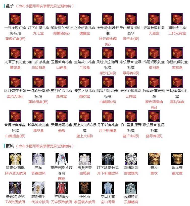 单盒成衣:[踏云盒衣, 金凤舞衣, 白凤舞衣, 黑凤舞衣, 蓝曲塘衣, 竹笛盒衣, 白海岛衣, 蓝海岛衣, 白忘川衣, 灵龙盒衣, 白幽馥衣替, 海阔盒衣, 熊猫盒衣, 白鹭衣, 白蛇盒衣, 绿故梦衣]
