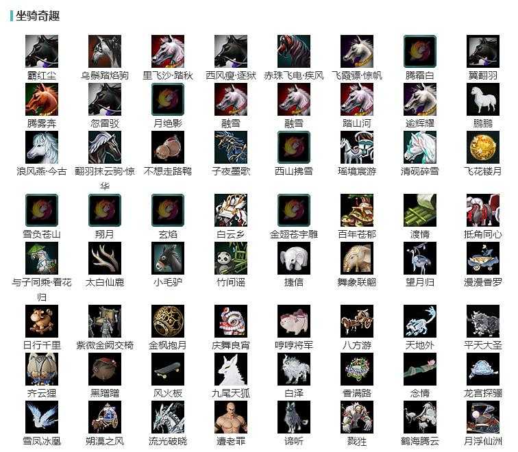 【坐骑】9个[西风瘦逐狱, 赤珠疾风, 飞霞骠惊帆, 翻羽抹云驹惊华, 里飞沙踏秋, 鹏鹏, 浪风燕今古, 霸红尘, 乌鬃踏焰驹]