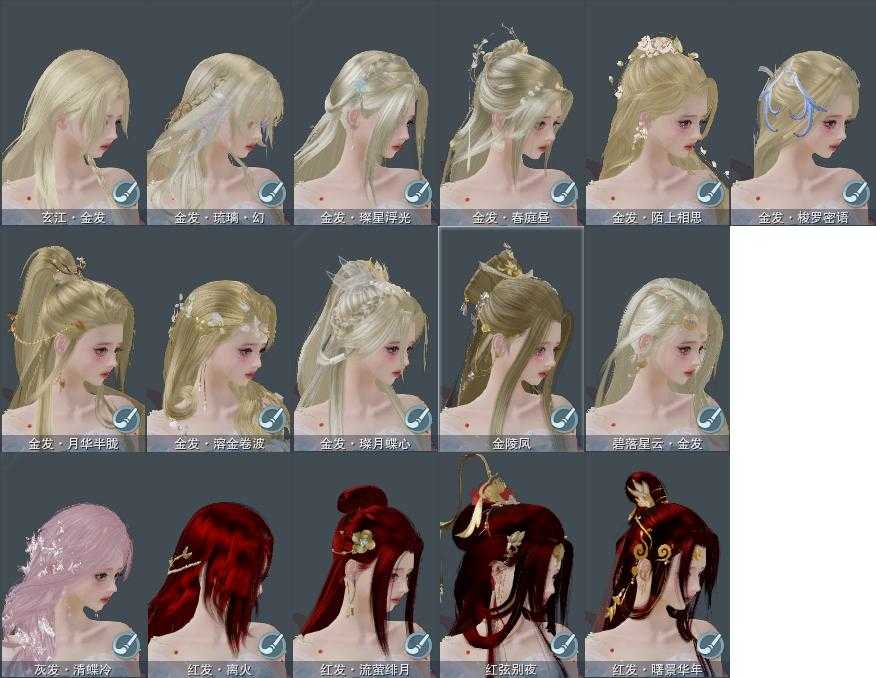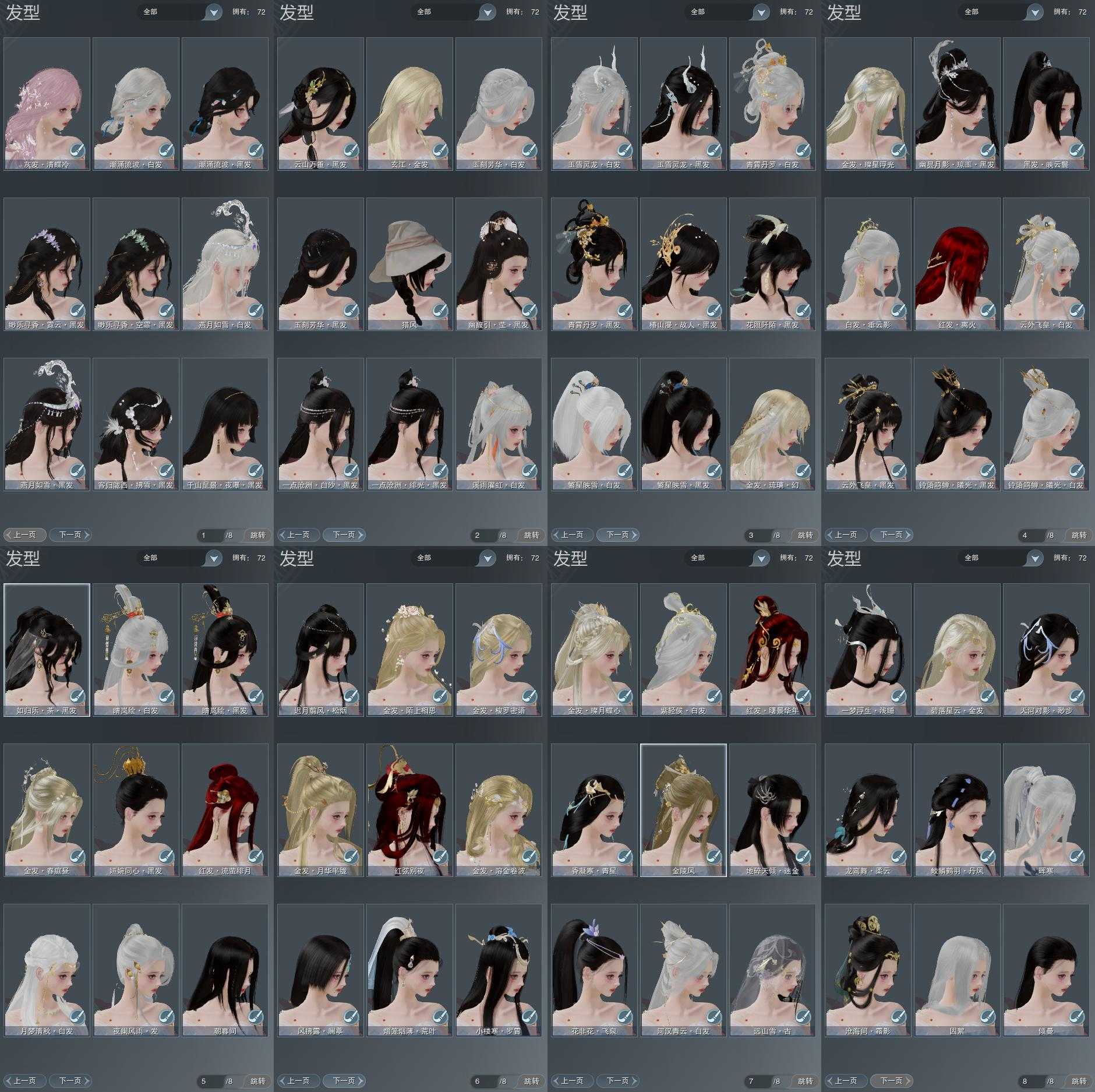 【发型】金发11个[一代金, 狐金, 资历金, 鼠金, 鸡金, 蝶金, 考金, 苏金, 雪金, 海金, 玄江金发], 红发5个[蝶粉, 猴红, 鸡红, 小资历红, 大资历红], 黑发37个, 白发17个, 盒子发型[四代七夕黑发, 黑端午白发, 三代中秋白, 晴岚绘黑发, 白楼兰黑发, 飞皇黑发, 晴岚绘白发, 白楼兰白发, 飞皇白发, 白幽昙黑发, 不良人盒黑发, 黑椿山黑发, 踏青黑发, 青霄盒黑发, 灵龙盒黑发, 不良人盒白发, 粉沧洲盒黑发, 紫沧洲盒黑发, 青霄盒白发, 灵龙白发, 虹兔盒白发, 白幽馥黑发, 黄千山黑发, 白陇西黑发, 燕月盒黑发, 紫寻香黑发, 绿寻香黑发, 燕月盒白发, 潮涌盒黑发, 潮涌盒白发], 总页数8