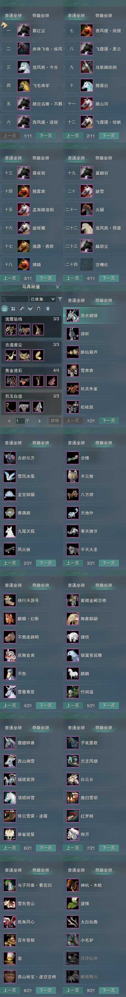 【坐骑】23个[踏炎不羁, 西风瘦烛银, 西风瘦逐狱, 赤珠疾风, 飞毛将军, 飞霞骠惊帆, 飞霞骠黑云, 浪风燕今古, 霸红尘, 乌鬃踏焰驹]