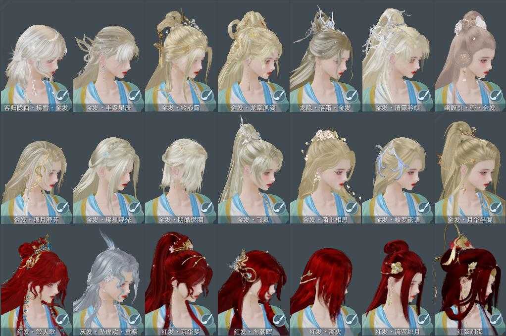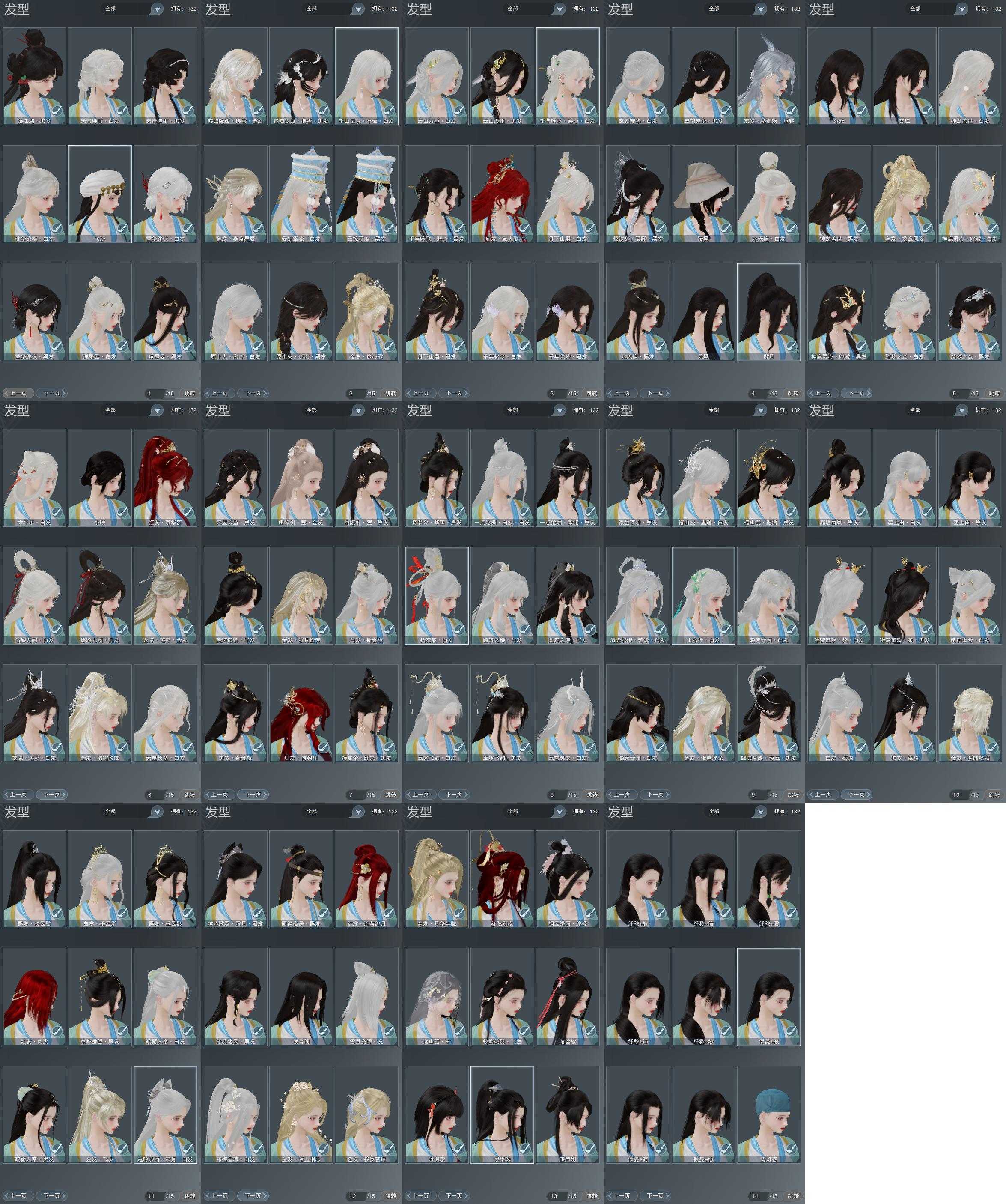 【发型】金发16个[资历金, 鸡金, 考金, 飒金, 双十二金发, 雪金, 蔷薇金, 穆金, 水母金, 龙金, 铃金, 玄江金发, 精灵金, 白幽馥金发, 蓝龙隐金发, 白陇西金发], 红发7个[十四红, 鸡红, 小资历红, 龙红, 大资历红, 十五红, 三代灰银], 黑发62个, 白发38个, 盒子发型[四代中秋蓝黑发, 雪月白发, 澡盒黑发, 四代中秋蓝白发, 澡盒白发, 狼盒黑发, 狼盒白发, 白幽昙黑发, 幽涧愀兮白发, 红椿山黑发, NPC白发, 蓝钻石盒白发, 灵龙盒黑发, 蓝兔盒黑发, 圆舞盒黑发, 蓝沧洲盒黑发, 蓝椿山白发, 白持君盒黑发, 灵龙白发, 红持君盒黑发, 蓝兔盒白发, 圆舞盒白发, 拈花盒白发, 紫沧洲盒白发, 白幽馥黑发, 天星盒黑发, 蓝龙隐黑发, 游龙盒黑发, 婚纱盒黑发, 天星盒白发, 粉鹿黑发, 游龙盒白发, 熊猫黑发, 白鹭黑发, 婚纱盒白发, 粉鹿白发, 梦盒黑发, 熊猫白发, 九七黑发, 青蛇盒黑发, 红上火黑发, 梦盒白发, 绿千山黑发, 九七白发, 青蛇盒白发, 云掠霜峰黑发, 红上火白发, 白陇西黑发, 白千山白发, 云掠霜峰白发, 瓷盒黑发, 瓷盒白发], 总页数14