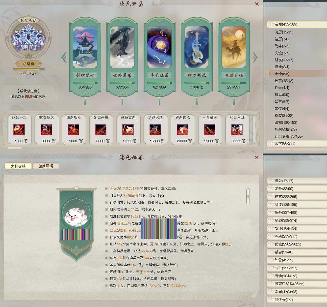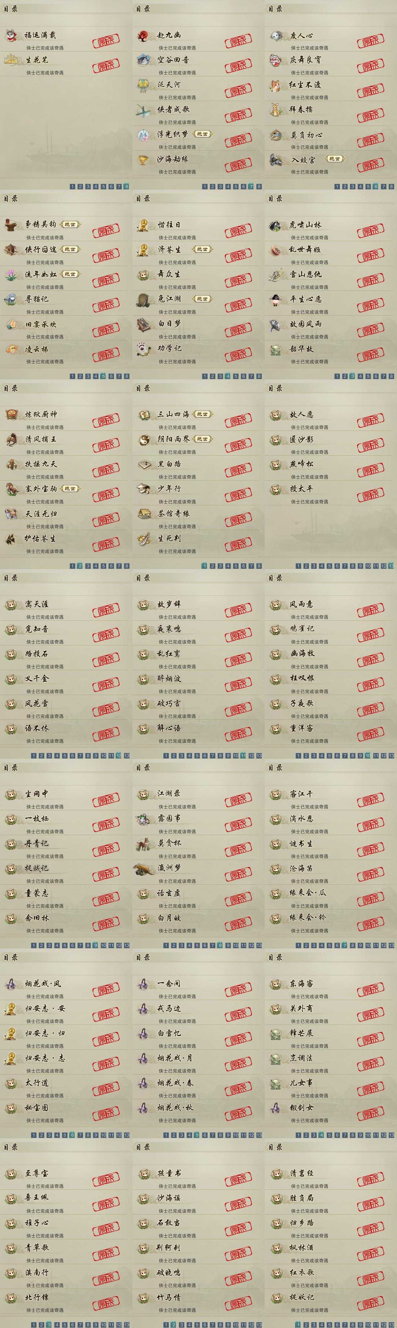 【奇遇】44个[白日梦, 天涯无归, 三山四海, 劝学记, 雪山恩仇, 阴阳两界, 莫负初心, 兔江湖, 平生心愿, 黑白路, 惜往日, 乱世舞姬, 塞外宝驹, 争铸吴钩, 虎啸山林, 韶华故, 济苍生, 护佑苍生, 少年行, 故园风雨, 扶摇九天, 流年如虹, 舞众生, 清风捕王, 侠行囧途, 寻猫记, 茶馆奇缘, 庆舞良宵, 入蛟宫, 生死判]