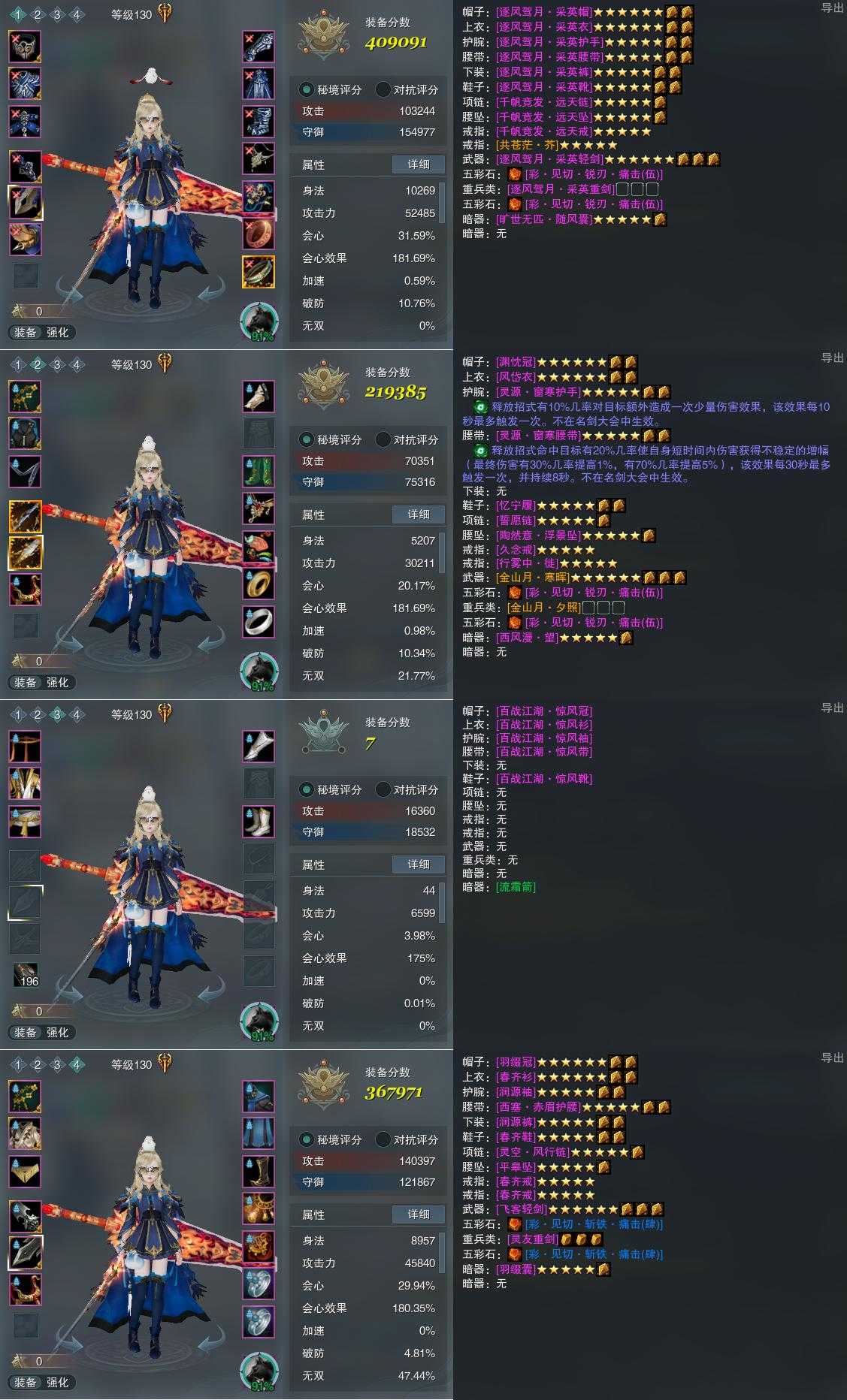 【装备】130级,山居剑意/问水诀PVP409091,装备二219385,装备三7,山居剑意/问水诀PVE367971