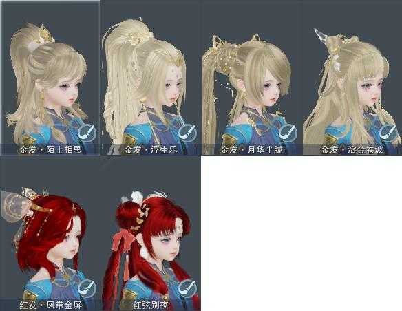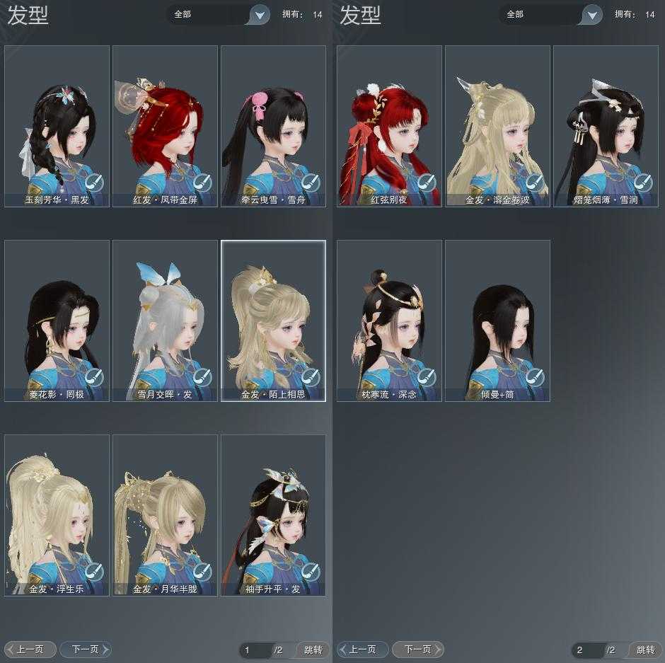 【发型】金发4个[鸡金, 蝶金, 喵金, 考金], 红发2个[鸡红, 狗红], 黑发6个, 白发4个, 盒子发型[元宵黑, 二代七夕白, 雪月白发], 总页数2