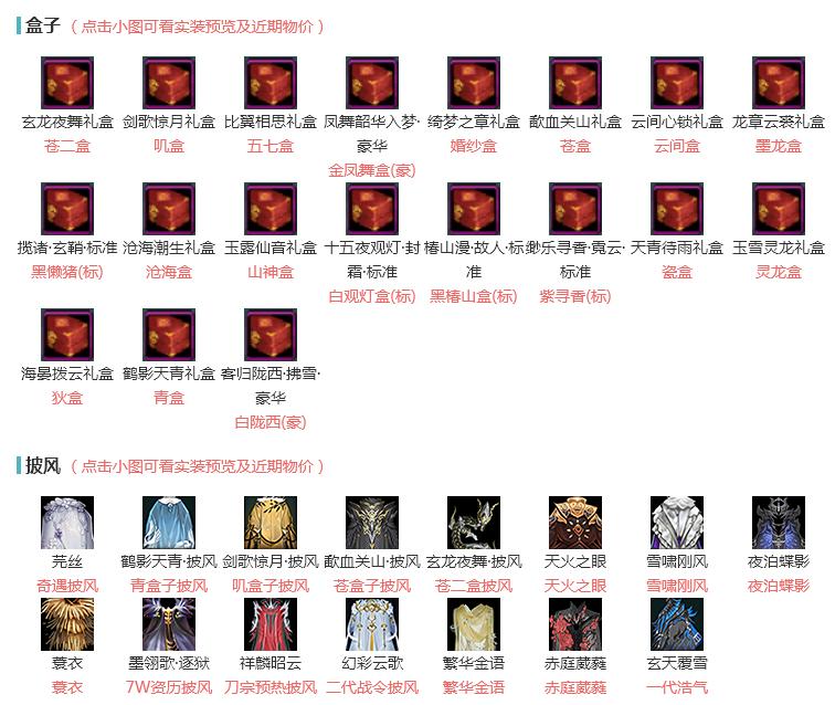 单盒成衣:[雪月盒衣, 四代七夕衣, 一代花朝黄衣, 旗袍衣, 白游园衣, 六中衣, 白海岛衣, 绿人间盒衣, 狼盒衣, 原色猪猪响衣, 绿幽昙衣, 红雪人衣, 策二盒衣, 白幽馥衣, 海阔盒衣, 熊猫盒衣, 白鹭衣, 瑶华盒成衣, 仙剑衣, 千手盒衣]