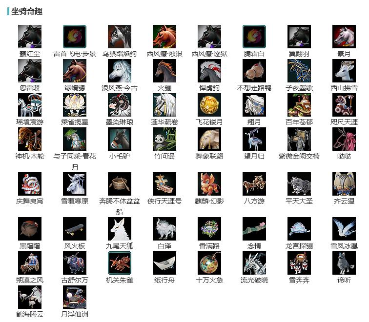 【坐骑】6个[西风瘦烛银, 西风瘦逐狱, 浪风燕今古, 霸红尘, 雷首飞电步景, 乌鬃踏焰驹]