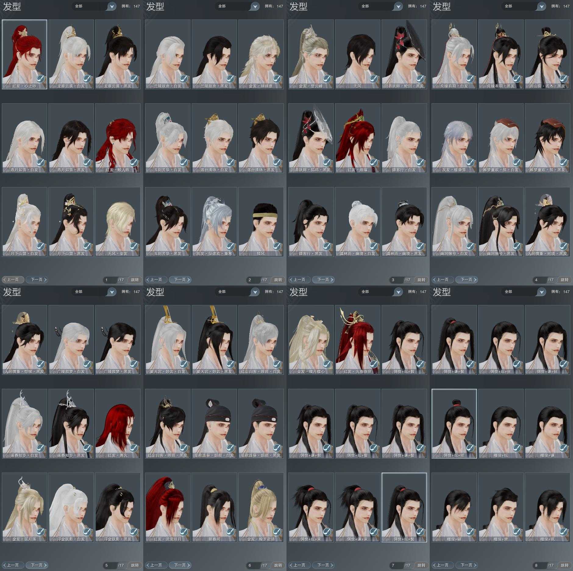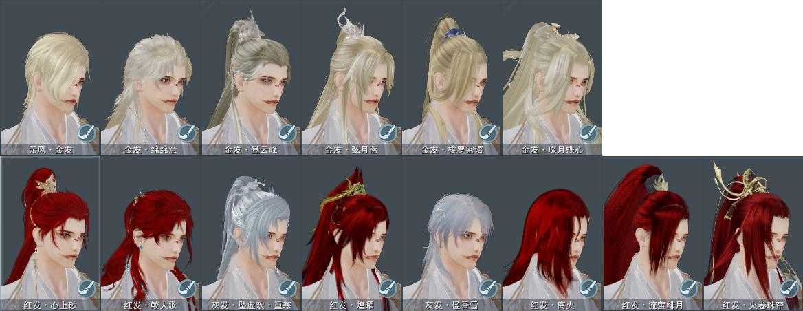 【发型】金发6个[狐金, 资历金, 巴卡金, 三代金, 咩金, 无风金发], 红发8个[六红, 兔红, 小资历红, 大资历红, 十五红, 蛇红, 一代灰, 三代灰银], 黑发25个, 白发17个, 盒子发型[唐风韶颜黑发, 黑红尘黑发, 黑狮黑发, 小金龙黑发, 唐风韶颜白发, 黑红尘白发, 黑狮白发, 小金龙白发, 红梅盒黑发, 古琴黑发, 黑人间黑发, 紫人间黑发, 红梅盒白发, 狼盒黑发, 古琴盒白发, 紫雨山前黑发, 七七黑发, 狼盒白发, 七七白发, 幽涧愀兮白发, 镖盒黑发, 黑傣族黑发, 镖盒白发, 黑傣族白发, 红白妖眸盒黑发, 红黑妖眸盒黑发, 莲台盒黑发, 兰陵盒黑发, 九七黑发, 莲台盒白发, 兰陵盒白发, 九七白发, 燕月盒黑发, 墨龙盒黑发, 燕月盒白发, 墨龙盒白发], 总页数8