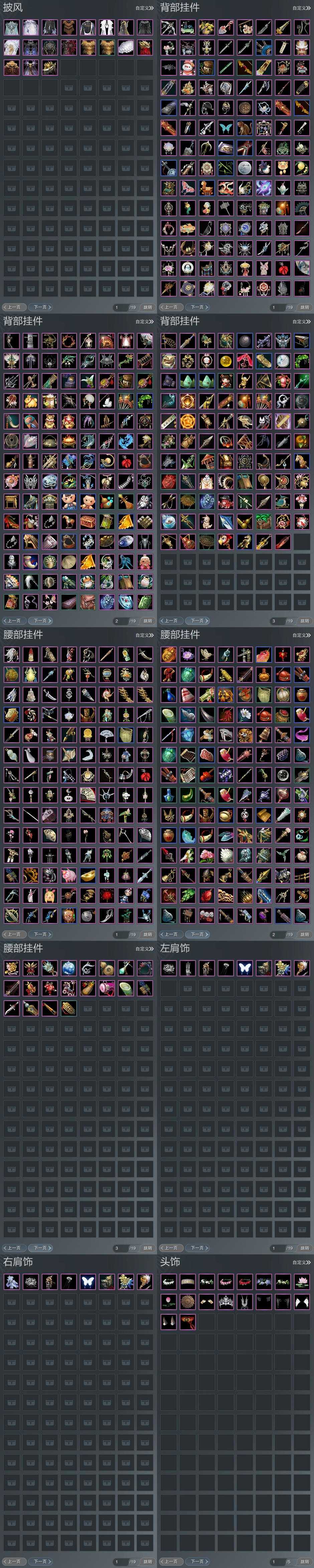 【披风】19个,[一代战令披风, 夜泊蝶影, 熔金烈风, 天火之眼, 7W资历披风, 黑盒子披风, 情R枕, 三山披风, 奇遇披风, 莲华盒披风, 狼头, 玉鸾雪, 星河玄梦, 云麒赫奕]