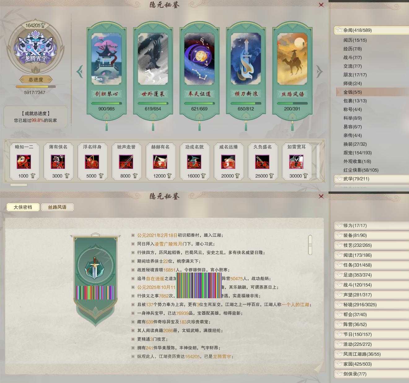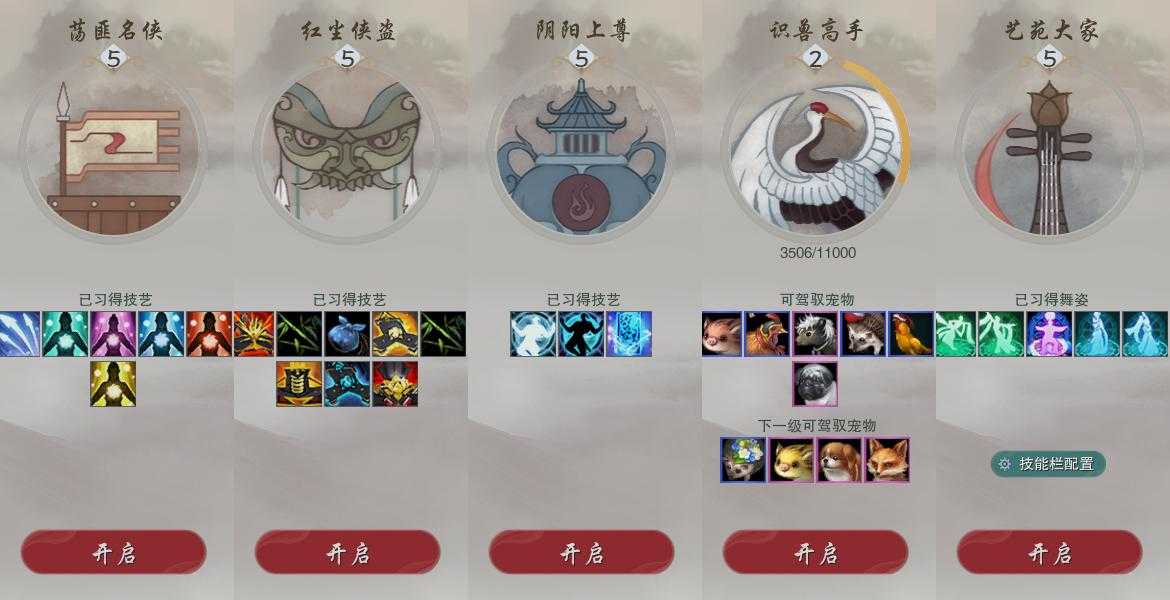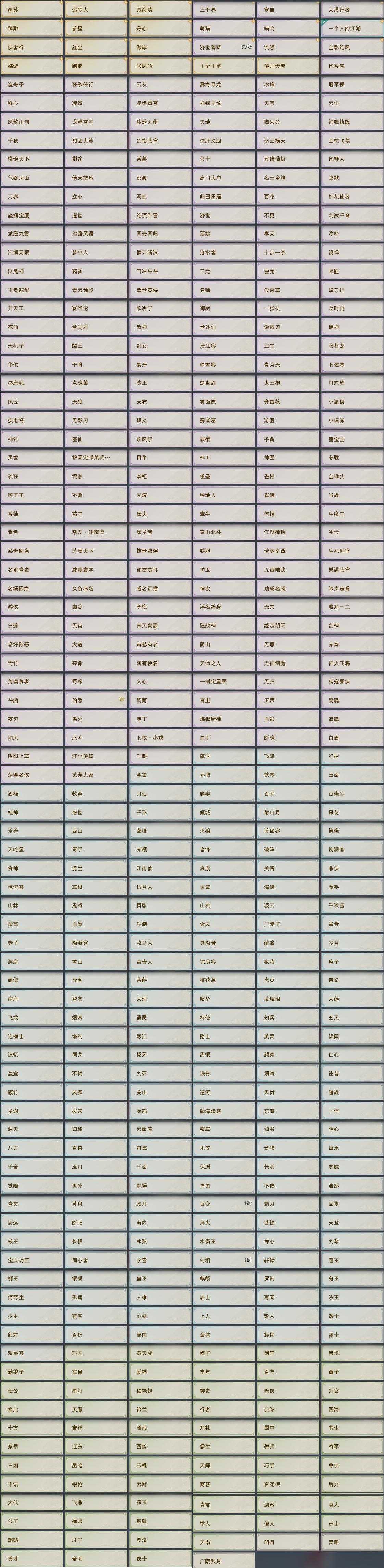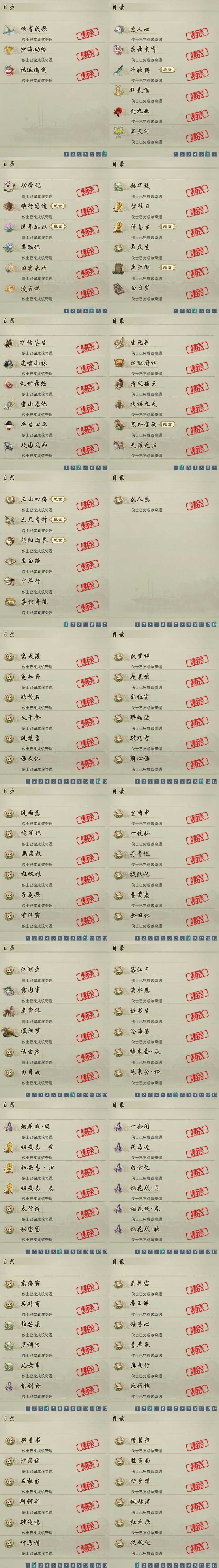 【奇遇】39个[白日梦, 天涯无归, 三山四海, 劝学记, 雪山恩仇, 阴阳两界, 兔江湖, 平生心愿, 黑白路, 惜往日, 乱世舞姬, 塞外宝驹, 韶华故, 虎啸山林, 济苍生, 护佑苍生, 少年行, 故园风雨, 扶摇九天, 三尺青锋, 流年如虹, 舞众生, 清风捕王, 侠行囧途, 寻猫记, 茶馆奇缘, 庆舞良宵, 生死判, 千秋铸, 凌云梯]