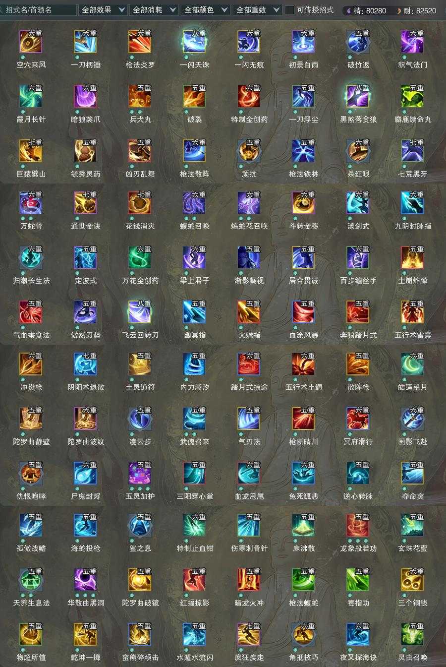 盒子:[黑盒, 唐风韶颜盒, 黑四元盒, 黑狮盒, 小金龙盒, 七七盒, 莲台盒, 红梅盒, 古琴盒, 狼盒(缺背挂), 黑人间盒(标), 镖盒, 紫人间盒(标), 紫雨山盒(标), 红白妖龙盒(标), 红黑妖龙盒(标), 莲华盒, 黑傣族盒(豪), 九七盒, 兰陵盒, 燕月盒, 墨龙盒]
