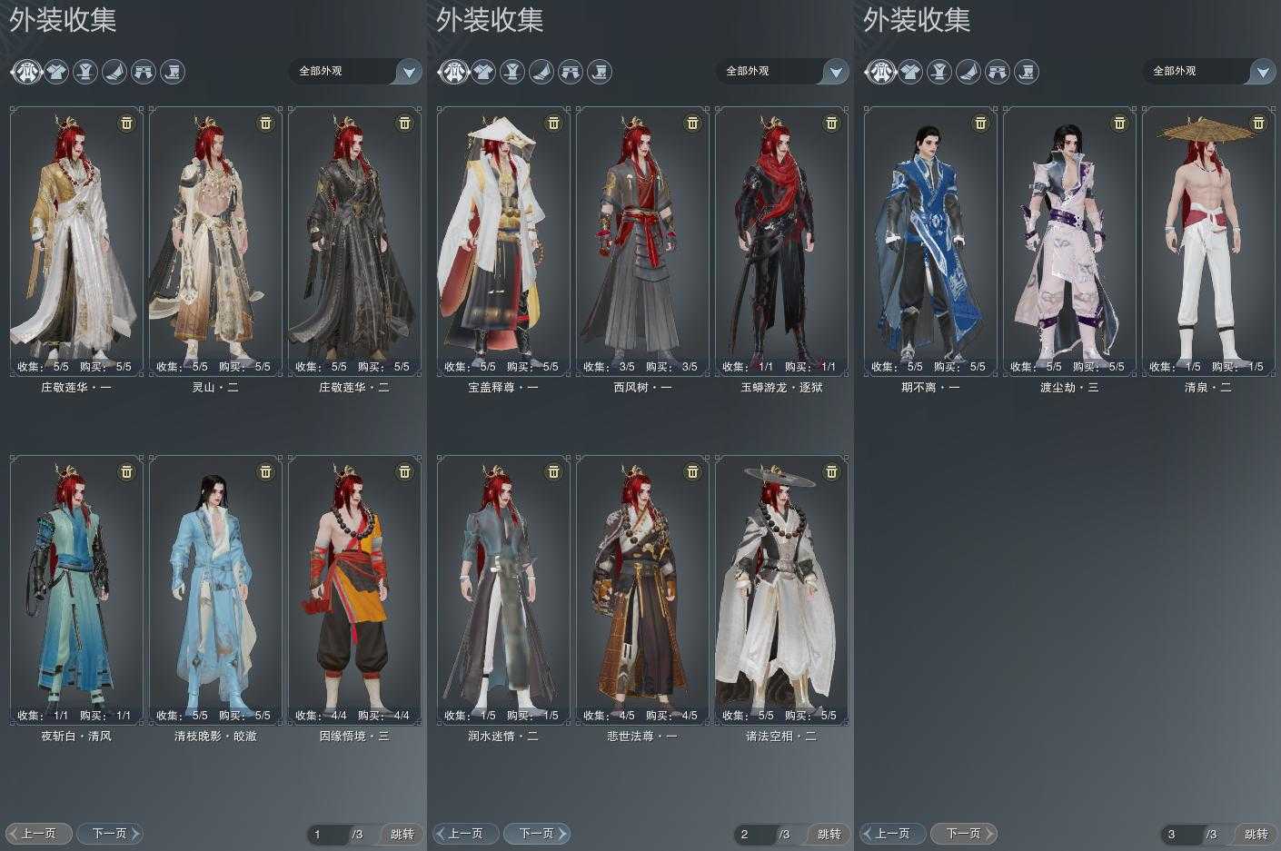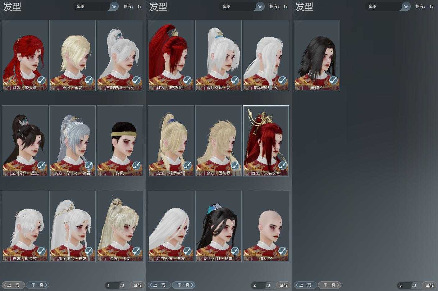 【发型】金发4个[猴金, 资历金, 飒金, 无风金发], 红发4个[六红, 小资历红, 十五红, 三代灰金], 黑发5个, 白发6个, 盒子发型[二代七夕白, 雪月白发, 幽涧愀兮白发], 总页数3
