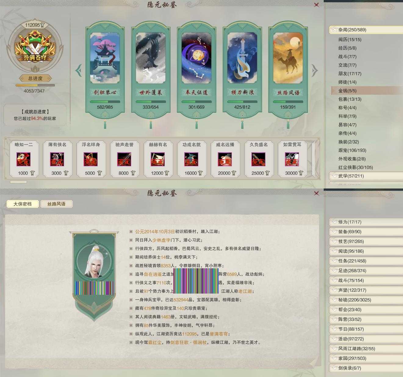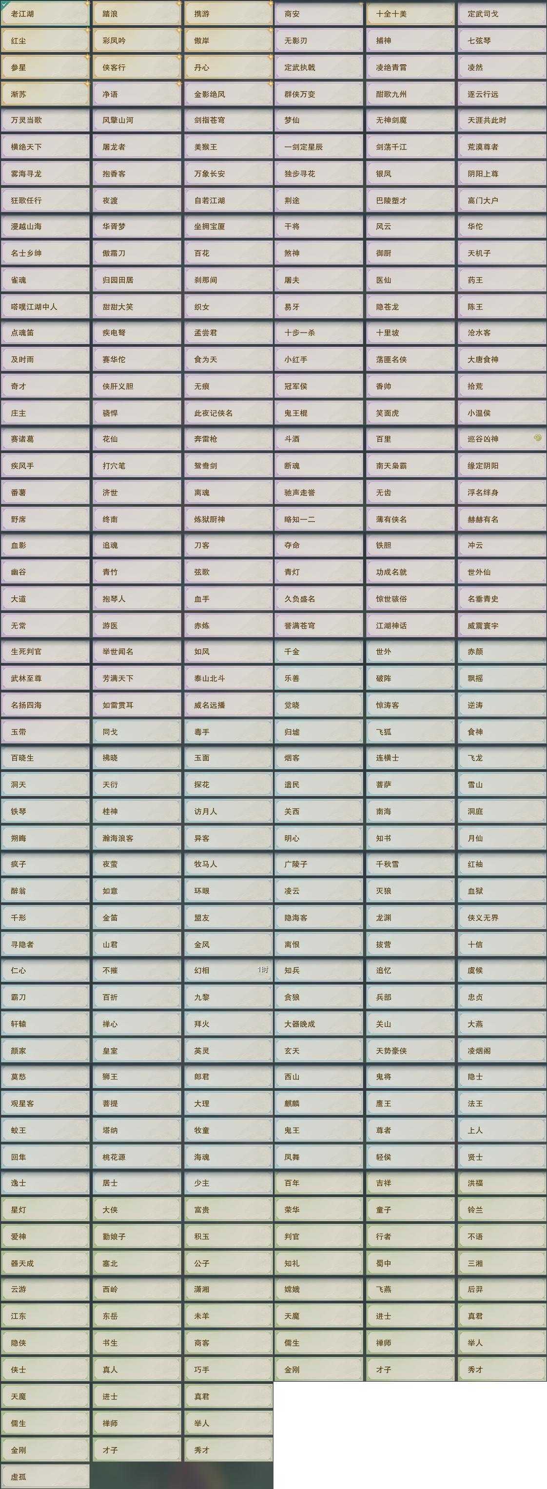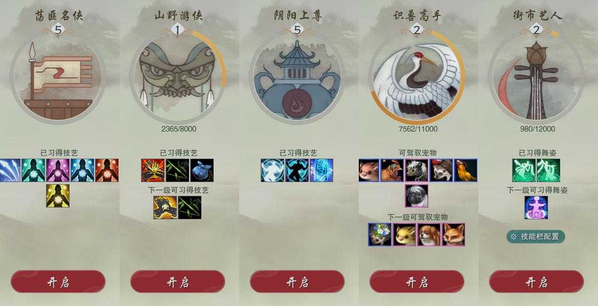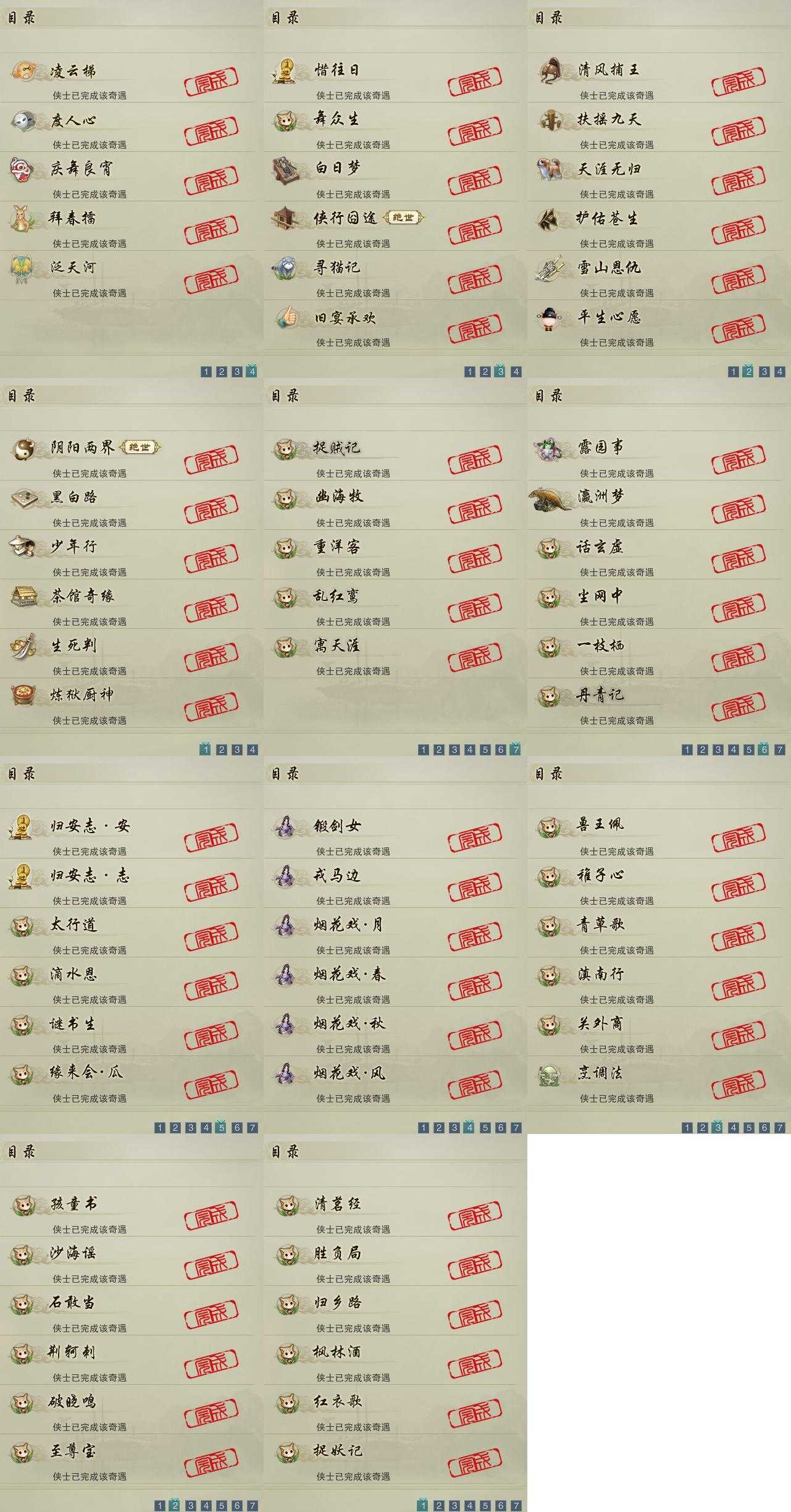 【奇遇】23个[白日梦, 天涯无归, 雪山恩仇, 阴阳两界, 平生心愿, 黑白路, 惜往日, 护佑苍生, 少年行, 扶摇九天, 舞众生, 清风捕王, 侠行囧途, 寻猫记, 茶馆奇缘, 庆舞良宵, 生死判, 凌云梯, 炼狱厨神, 度人心, 旧宴承欢, 泛天河, 拜春擂]