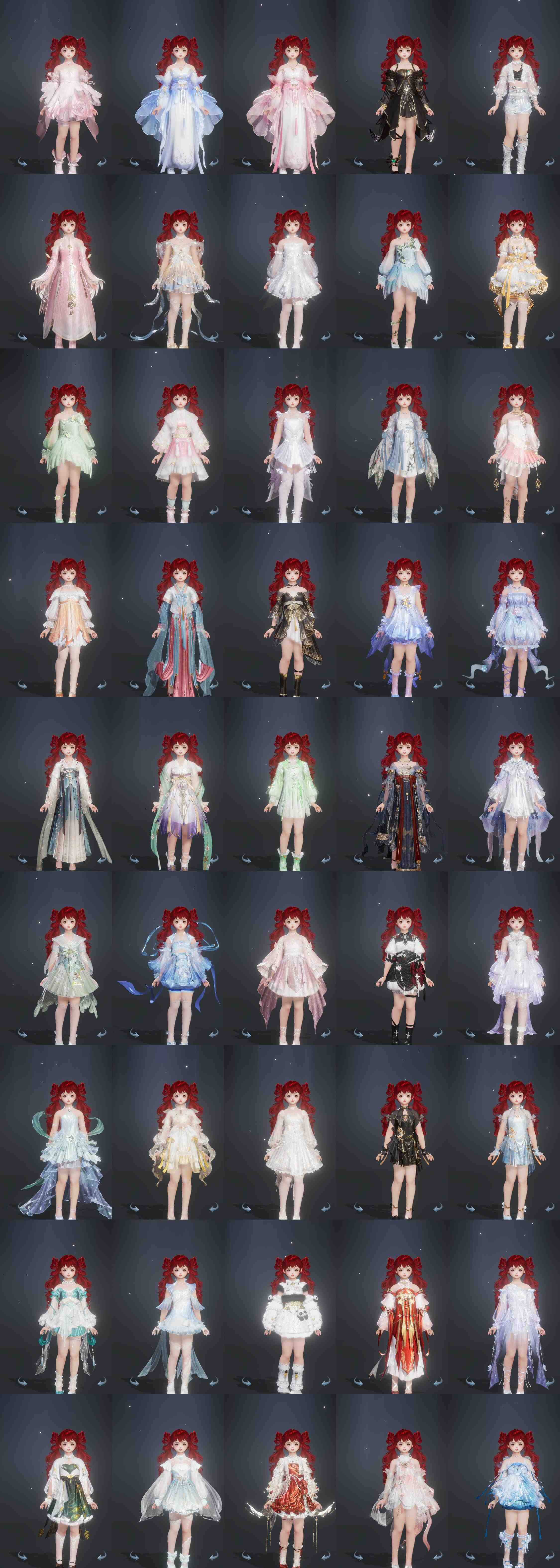 复刻:[沧海间湘月, 复刻粉玫瑰, 沧海间琼台, 风华深冕, 白机车, 复刻粉二娃, 天选黄无色, 白二公主, 复刻蓝不欺, 黄月凝清宵, 复刻绿不欺, 彩云归皎月, 花非花晴荼, 五期福袋成衣, 河汉绯玉, 风拂露夜璧, 风拂露月琮, 绿云霆]