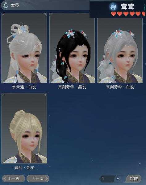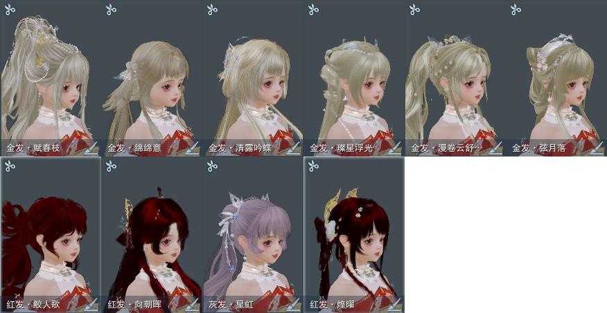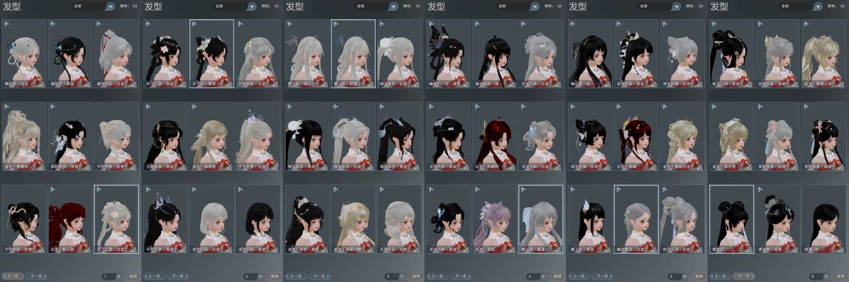 【发型】金发7个[巴卡金, 云金, 雪金, 水母金, 咩金, 傲月金发, 蛇金], 红发4个[十四红, 兔红, 十五红, 二代灰], 黑发23个, 白发21个, 盒子发型[唐风韶颜黑发, 唐风韶颜白发, 二胡黑发, 二胡白发, 幽涧愀兮白发, 蓝钻石盒黑发, 黑椿山黑发, 踏青黑发, 蓝钻石盒白发, 蓝兔盒黑发, 蓝椿山白发, 蓝兔盒白发, 八七盒黑发, 黑幽馥黑发, 白龙隐黑发, 八七盒白发, 天星盒白发, 海阔盒黑发, 熊猫黑发, 龙吟盒黑发, 梦盒黑发, 兰陵盒黑发, 海阔盒白发, 熊猫白发, 蓝月下黑发, 九七黑发, 蓝鹭白发, 白蛇盒黑发, 粉鹭白发, 龙吟盒白发, 梦盒白发, 兰陵盒白发, 九七白发, 白蛇盒白发, 白陇西黑发], 总页数6