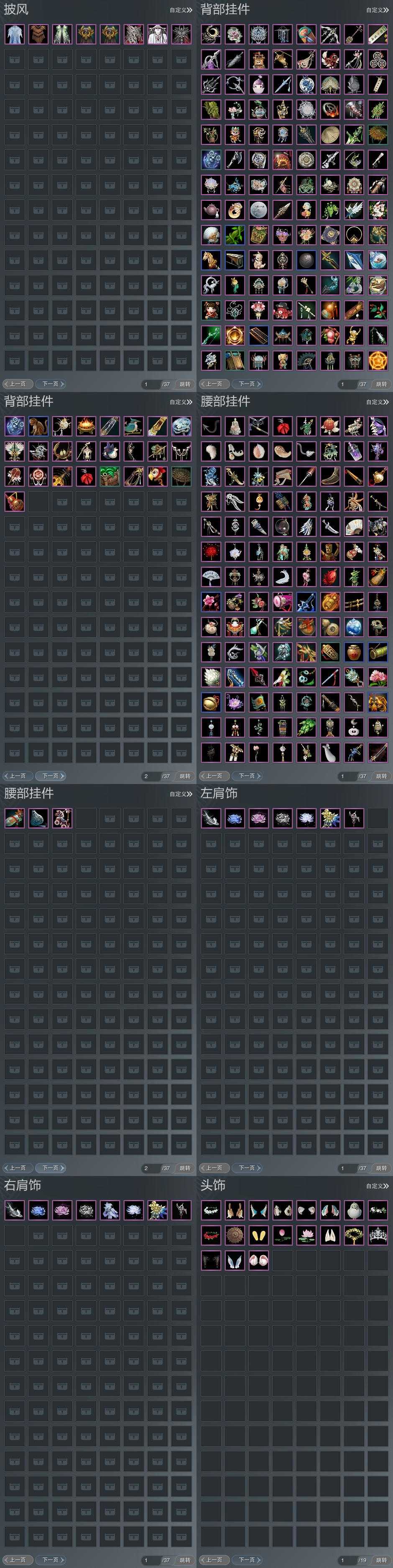【肩饰】7左,8右,[双鱼曳波·无量·左, 绝代仙·玉璃·左, 绝代仙·神姿·左, 绝代仙·墨楼·左, 绝代仙·千幻·左, 云旌望捷·左][绝代仙·玉璃·右, 绝代仙·神姿·右, 绝代仙·墨楼·右, 绝代仙·千幻·右, 云旌望捷·右]