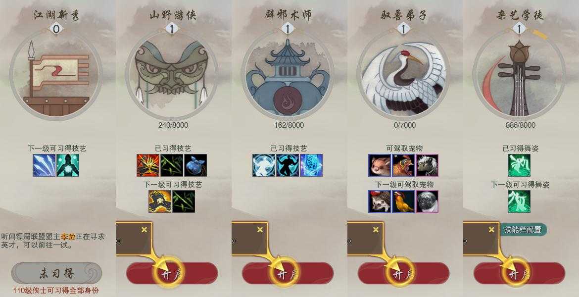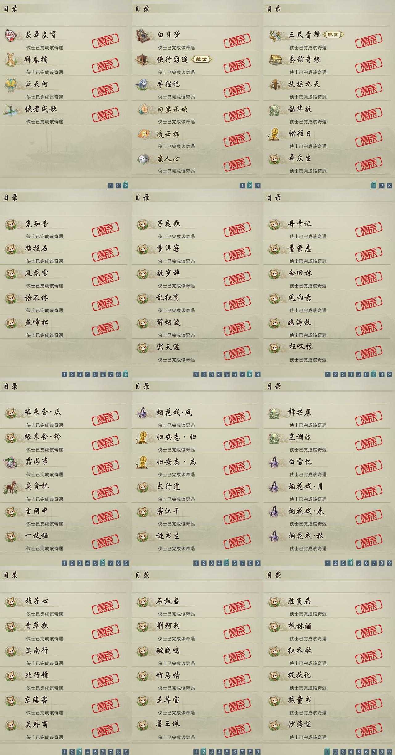 【奇遇】16个[白日梦, 惜往日, 韶华故, 三尺青锋, 扶摇九天, 舞众生, 侠行囧途, 寻猫记, 茶馆奇缘, 庆舞良宵, 凌云梯, 度人心, 旧宴承欢, 泛天河, 侠者成歌, 拜春擂]